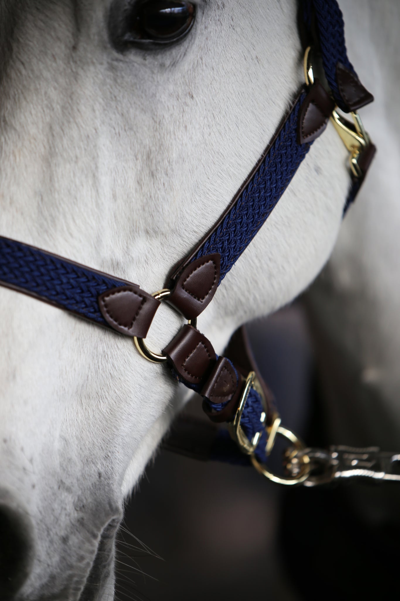 Fabricado con cuero artificial (100% libre de productos animales), este cabezal presenta un elegante diseño trenzado de nailon en color azul marino. El cuero artificial ha sido especialmente desarrollado para no absorber agua ni suciedad, y para no romperse ni cambiar de color. Más flexible que el cuero real, este cabezal es perfecto para el uso diario, pero lo suficientemente elegante para concursos de varios días o para el transporte.