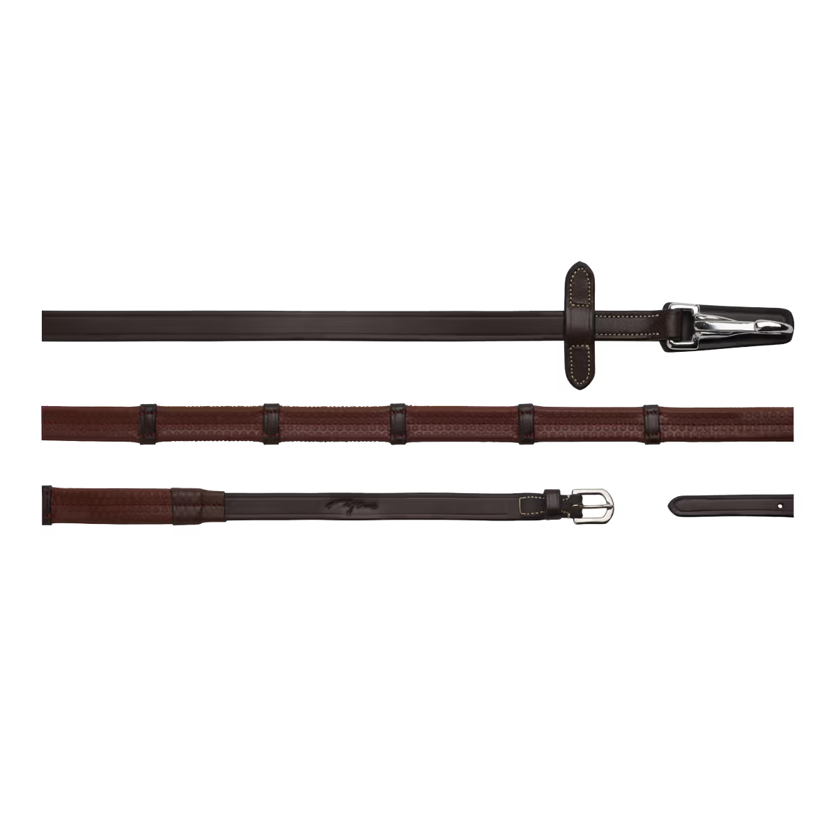 Las riendas de cuero son muy suaves y flexibles, con un aspecto clásico y elegante. Sin embargo, pueden resbalar rápidamente entre tus manos cuando se mojan o si el caballo comienza a tirar. Por eso, a menudo se ven riendas de cuero con jinetes de doma. En la doma, el jinete necesita poder ajustar la longitud de la rienda muy fácilmente sin perturbar la conexión con el caballo. En las clases de doma más avanzadas con filetes de bocado de brida, se utilizarán principalmente riendas delgadas, ya que el jinete necesita manejar 2 riendas en cada mano.
