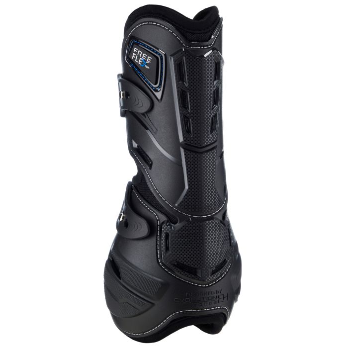 "Protección contra Impactos de Concha Dura y Flexión", diseñadas para contornear anatómicamente el tendón y el corvejón para ofrecer un confort y rendimiento superior. El revolucionario diseño de molde de inyección con recorte permite un rango de movimiento natural sin interferencias, tanto en el suelo como fuera de él. Las zonas elevadas de impacto en la parte trasera de la bota crean protección contra impactos con un diseño multi-ventilado que permite la ventilación en toda la bota para la transferencia de calor. Las protectores tradicionales de concha suave y cuero siempre han ofrecido protección contra golpes, pero el inconveniente era una protección limitada contra un golpe. Esto llevó a muchos diseños de concha dura que ofrecen esta protección, pero debido a la naturaleza de la "concha dura", limitan el rango de movimiento natural del caballo. La gama FreeFlex ha sido desarrollada para ser la evolución natural de estos productos y la máxima híbrida que combina lo mejor de todos los diseños que han surgido antes.