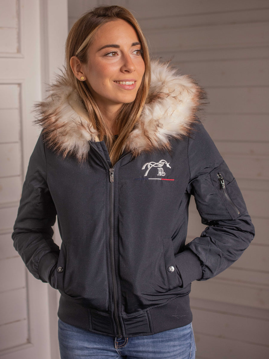 Penelope Lyon Women's Bomber Jacket - stay warm and stylish this winter with this signature sporty ladies bomber jacket lined with super soft fake fur. The lining is so fluffy and amazing and feels so luxurious that you won't want to wear anything else. The large faux fur hood ensures you'll stay snug and warm on cold days. Two large front pockets with buttons and a zipped pocket on the left arm allow you to store your valuables when riding and hacking out. The jacket is lined with super soft teddy fur which feels amazing and is so cute! The outer shell is water, wind and dirt repellent. The jacket is also easy to wash.