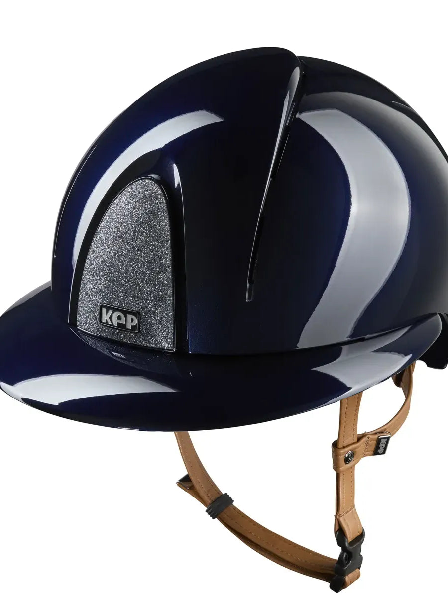 KEP Riding Helmet Smart Nova Polish Polo Visor Star Silver - Beige Strap  - delivers a striking blend of polished elegance, advanced safety, and high-performance equestrian design. The high-gloss polished shell is enhanced with a brilliant silver Star glitter top, giving the helmet a luminous, eye-catching sparkle ideal for dressage, show jumping, training, and everyday riding. The Polo Visor provides extended sun protection and a refined silhouette, while the beige eco-leather chin strap adds a chic contrast that elevates the entire look. This model is perfect for riders seeking a glamorous, modern riding helmet with elite safety certifications, Italian craftsmanship, and a shimmering silver-sparkle finish.