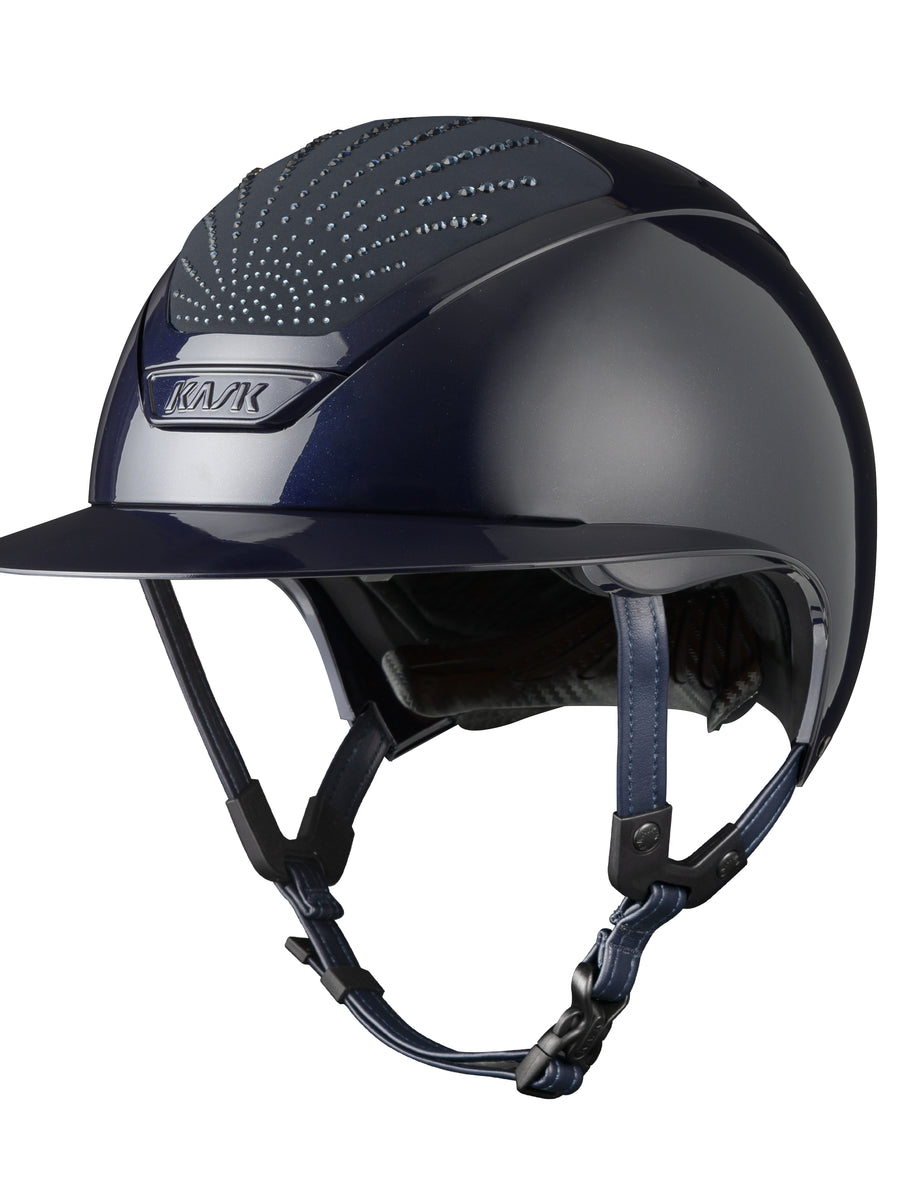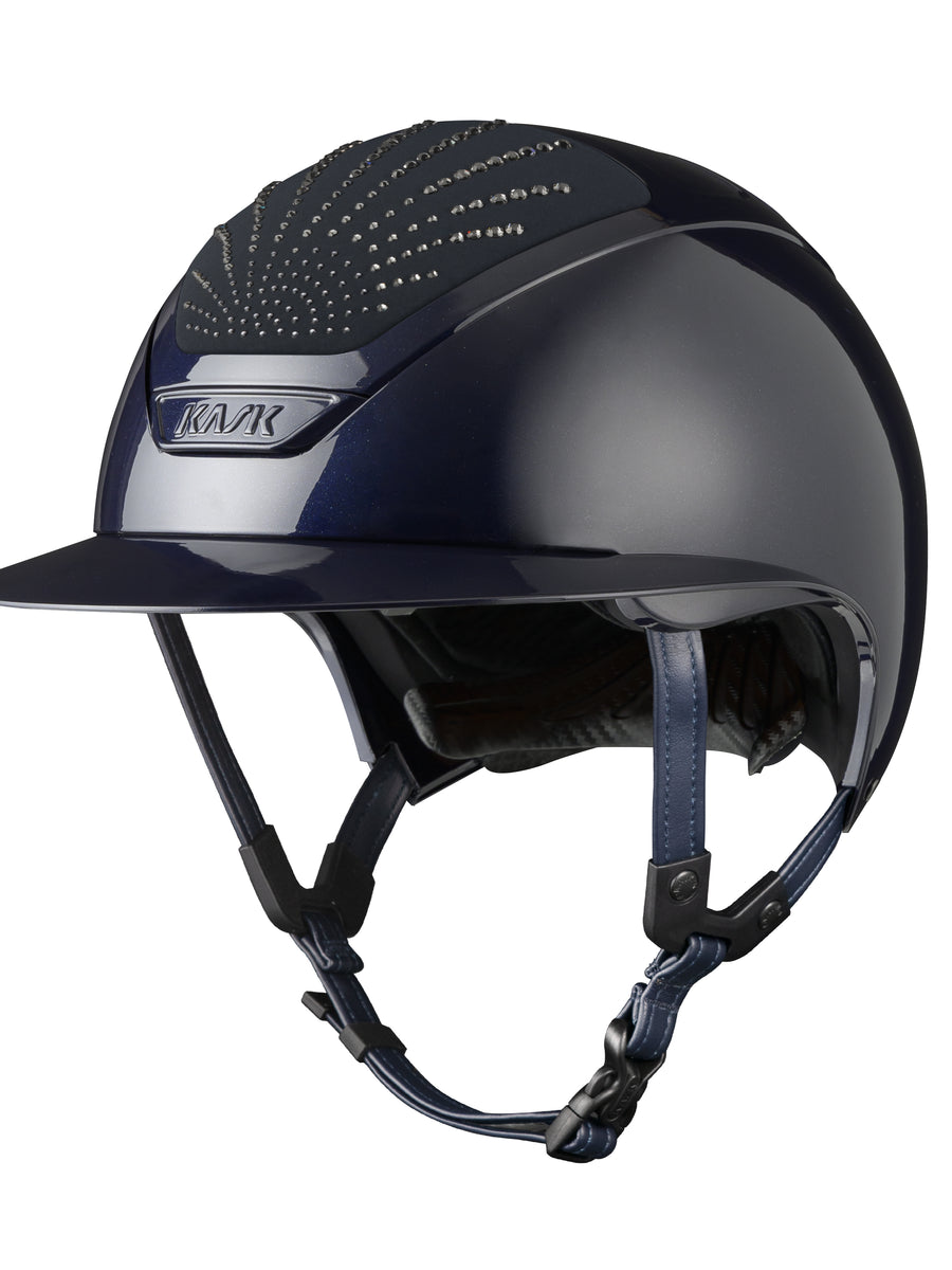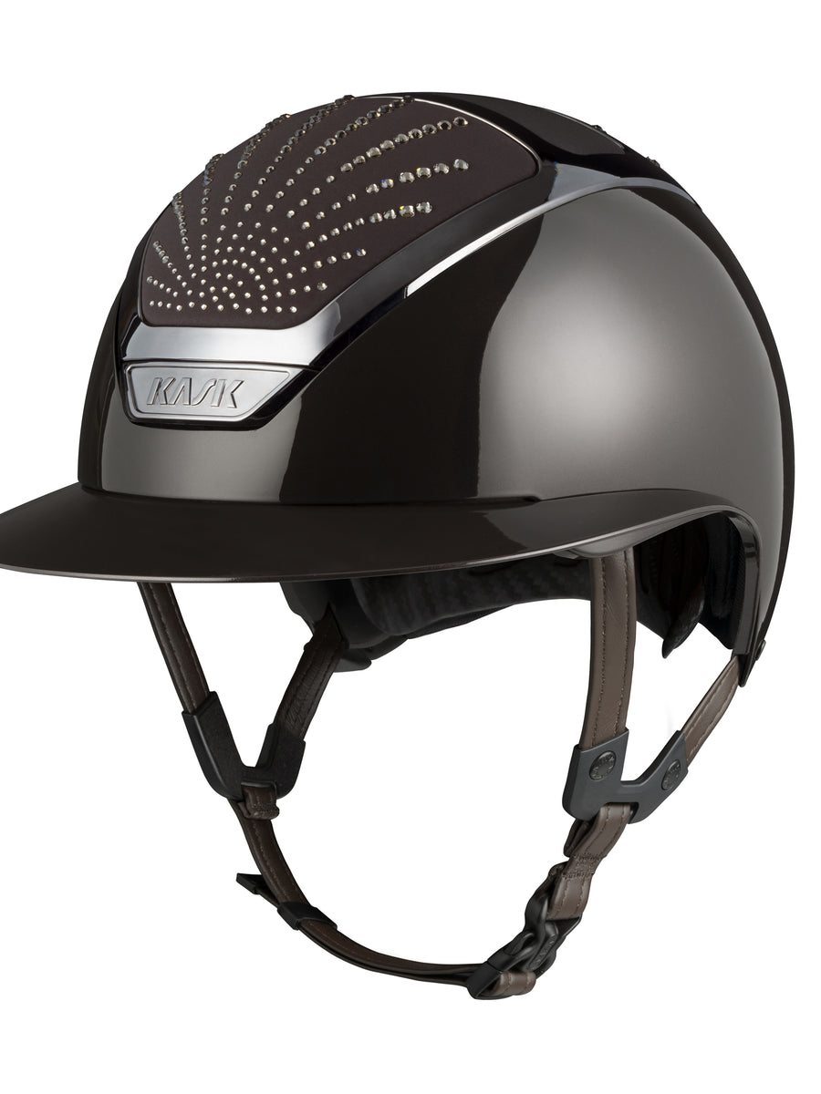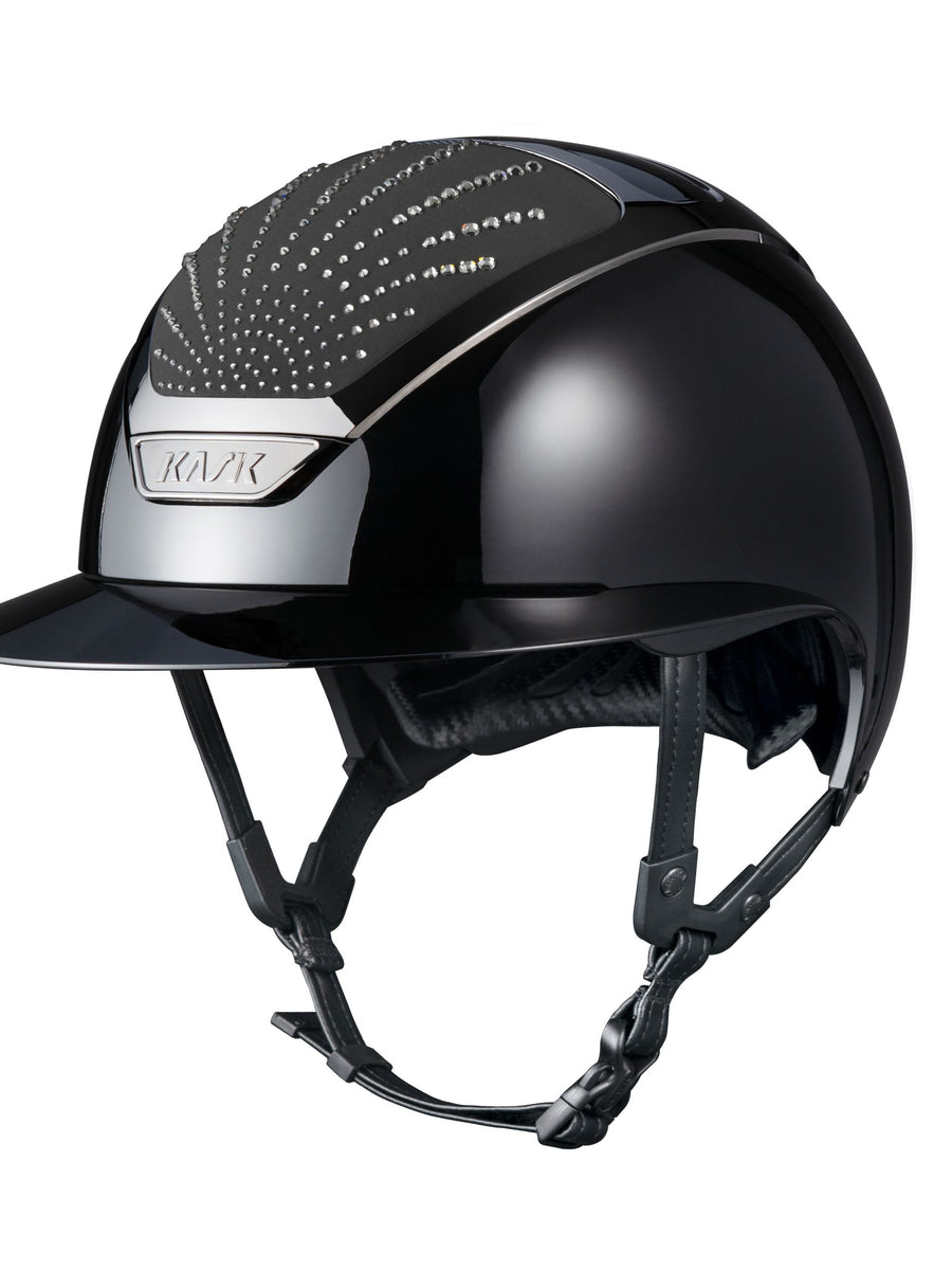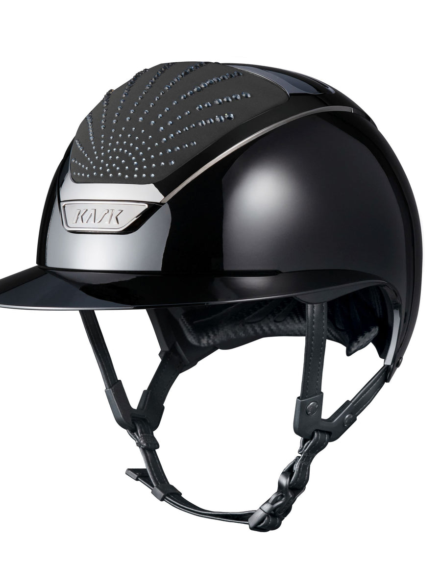 Kask Riding Helmet Star Lady Pure Shine Origin - this gorgeous riding helmet for lady equestrians offers luxurious style and exception comfort. Featuring Swarovski crystals in a stylish design, this helmet is a true head turner. With its wide peak for extra sun protection, the Star Lady guarantees comfort, safety and high performance all while remaining incredibly elegant. Characterized by its shining frame, the Star Lady is a unique helmet that you will fall in love with. Choose from various color combinations to perfectly match your competition outfit.
