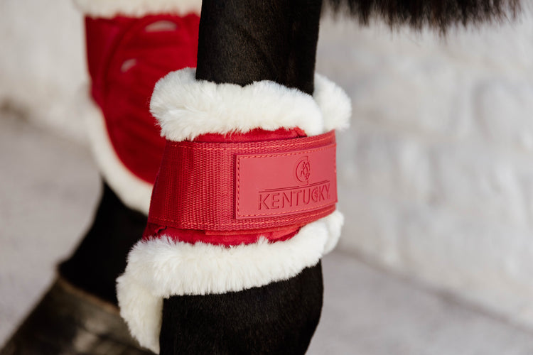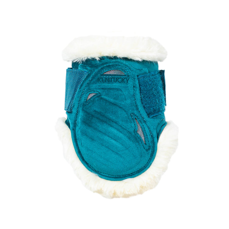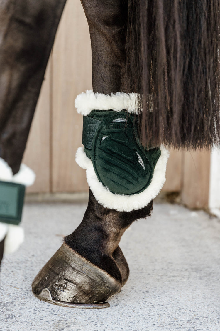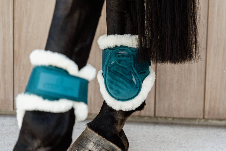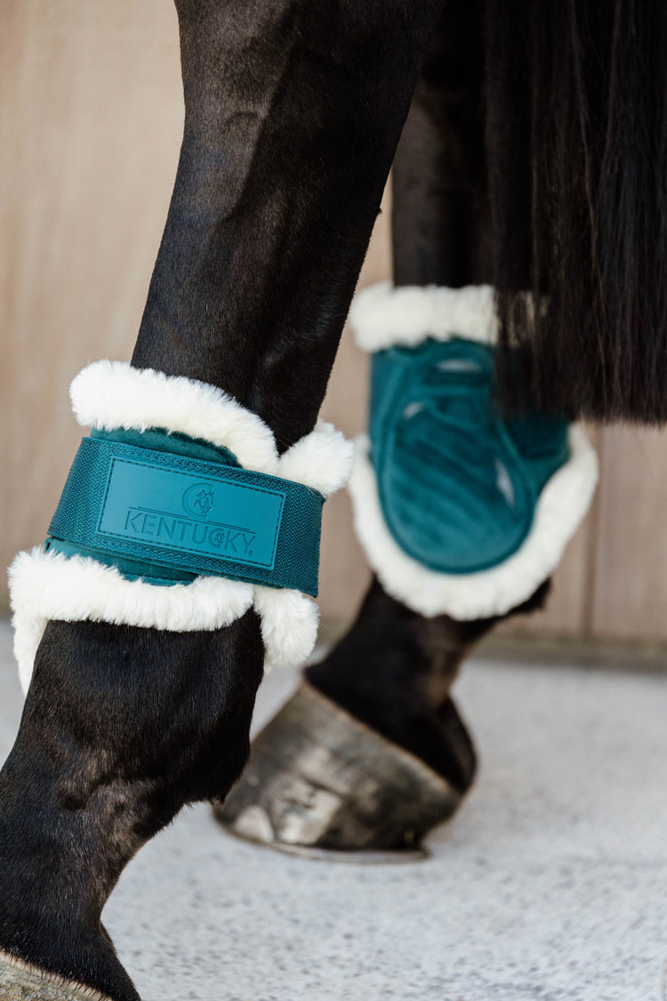 Kentucky Vegan Sheepskin Young Horse Fetlock Boots Velvet - now available in two new colors: old rose and emerald! Get the hind boots that match the saddle pads and ear bonnets from Kentucky!