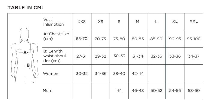 Waist (cm) | 62,5 / 66,5 | 66,5 / 70,5 | 70,5 / 74,5 | 74,5 / 78,5 | 78,5 / 82,5 | 82,5 / 86,5 | 86,5 / 90,5 | 90,5 / 94,5 |