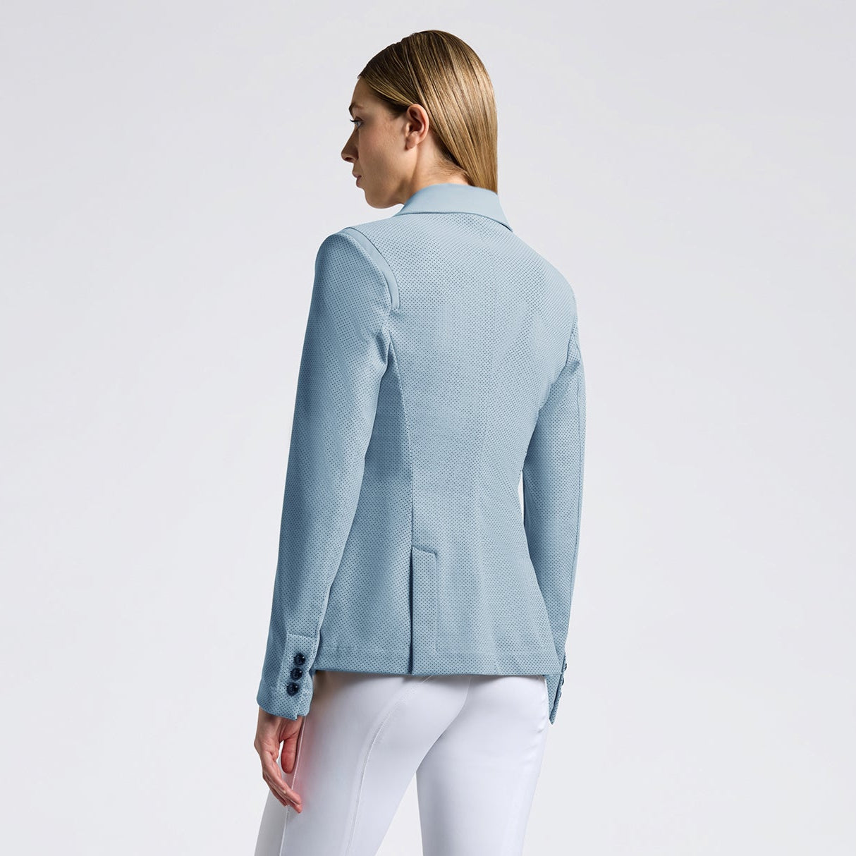 Cavalleria Toscana All Over Perforated Ladies Show Jacket Light Blue - this stunning competition jacket combines highly technical materials with beautiful Italian design. Fully perforated, it's a must have jacket for competing in during the hot summer months! The functional 4-way stretch perforated jersey is both high performing and elegant, whilst the unique color will ensure you're turning heads for all the right reasons. The special blend of materials makes it highly breathable and flexible to allow a maximum range of motion while you are riding. In addition to this, the material has antibacterial properties and is water repellent.