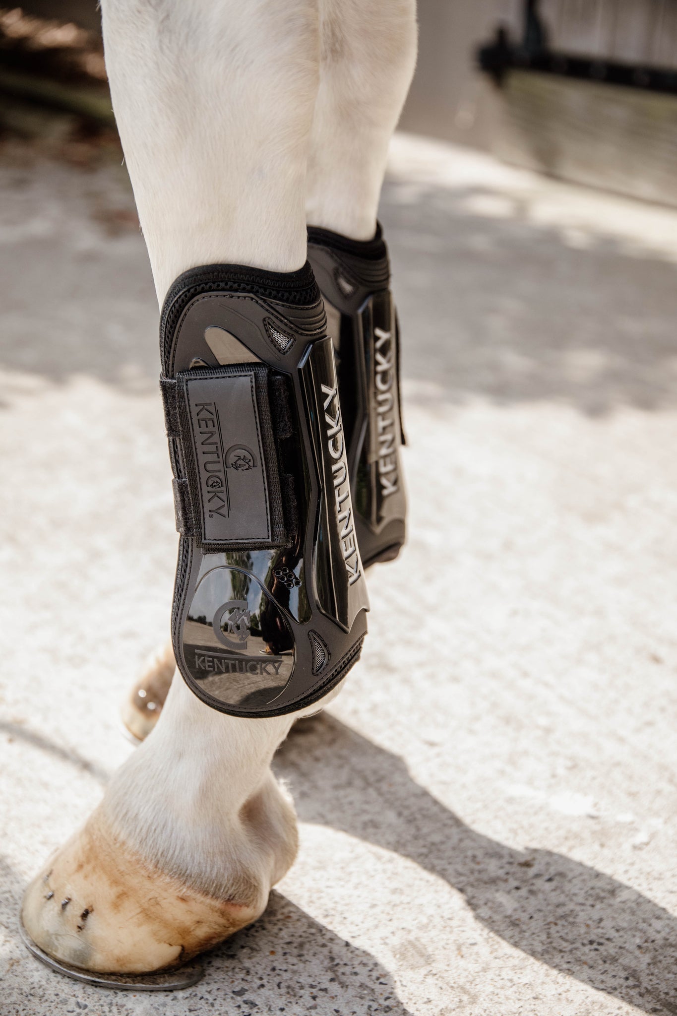 Kentucky Tendon Boots Velcro - New and improved, these front jumping boots with velcro closures offer maximum freedom of movement, optimal ventilation and superior protection. The robust yet lightweight TPU shell is equipped with multiple ventilation holes and a mesh triangle for optimal cooling. Furthermore, the highly breathable 3D Spacer lining provides the highest comfort and breathability.