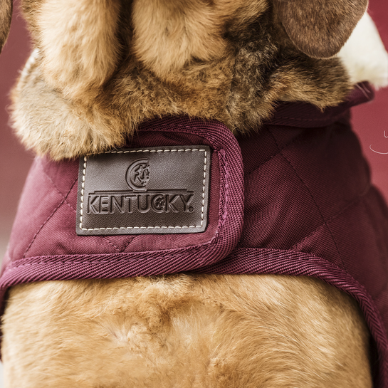 This outstanding Dog Coat was made to match the line of horse rugs from Kentucky Horsewear. It has a filling of 160g and features Kentucky's signature artificial rabbit skin lining for extra comfort, which creates tiny air pockets that trap and retain the body heat of the dog. The soft lining also polishes the dog’s coat and the artificial sheepskin on the neck offers comfort and warmth. This hood can be folded open over the neck for extra cover.