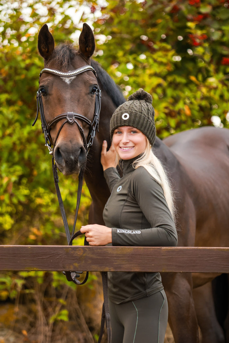 Kingsland Ladies Knitted Beanie KLSemira - keep your head and ears warm during the winter months with this simple yet stylish winter hat from Kingsland Equestrian. The knitted hat is made from a wool-mix yarn fabric in large cable-knit with a large pom pom on the top for a great look. With fleece lining on the inside for extra warmth and comfort, the beanie is styled with a Kingsland logo patch on the front in rose gold.