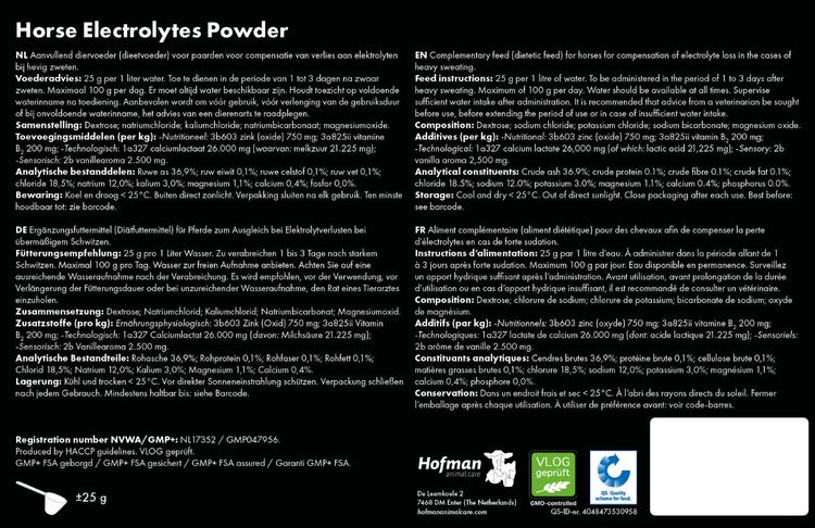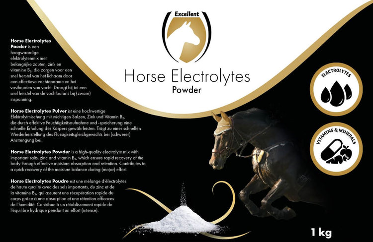 Excellent Horse Electrolytes Powder - replenish your horses lost electrolytes with this unique dextrose-mix for an effective recovery. When sweating heavily, a horse loses electrolytes (salts such as chloride, sodium, potassium, magnesium and calcium) and trace elements (such as zinc) in addition to moisture. A horses's sweat contains more electrolytes per liter of fluid than blood or any other bodily fluid, which is why it is incredibly important to replenish them after work.
