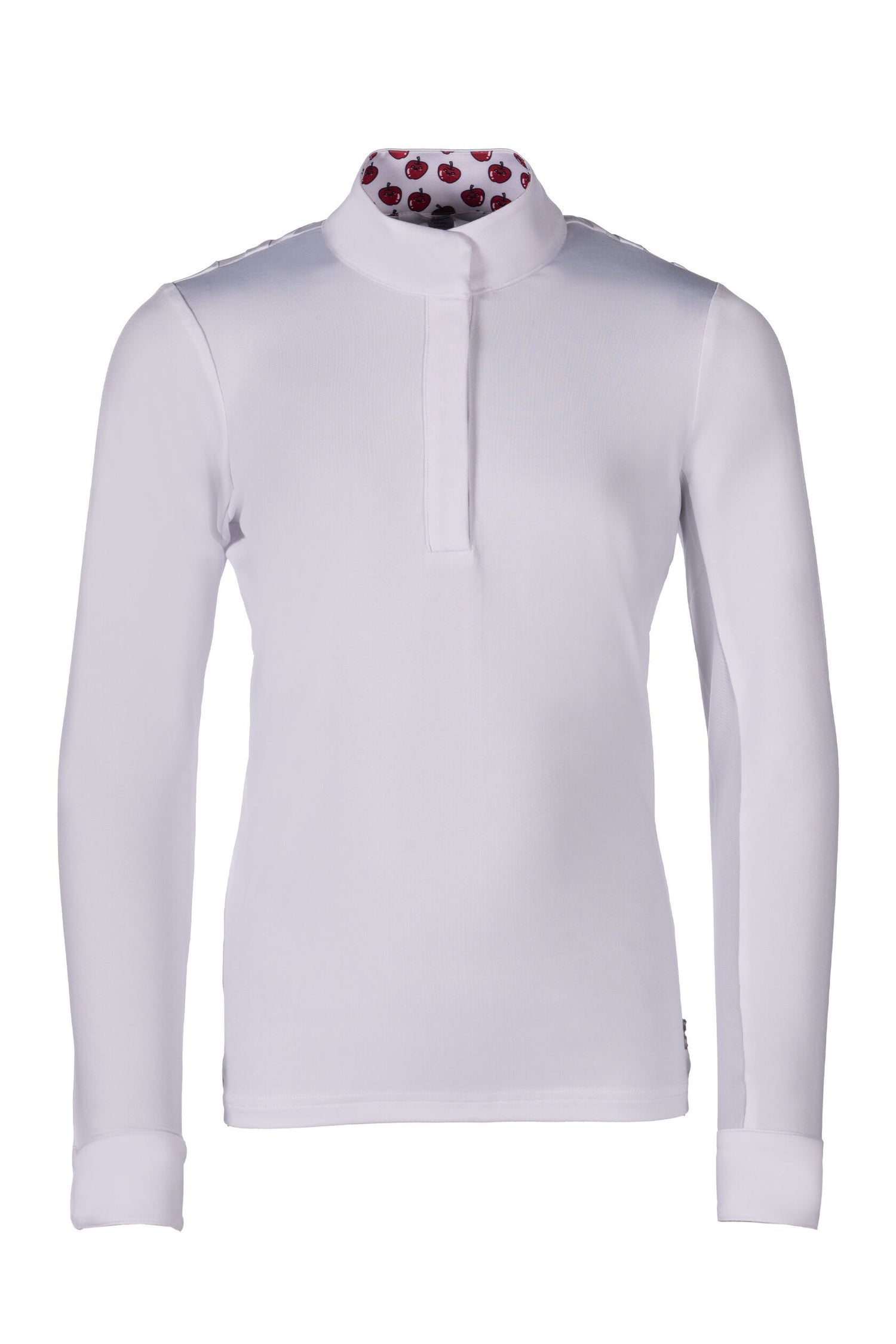 Targeted mesh inserts enhance airflow where it matters, keeping the rider feeling fresh under a show jacket. A neat stand-up collar provides a classic competition finish, and a playful cherry-inspired decorative print on the inside collar adds a discreet touch of character. Blending technical fabric choices with equestrian elegance, this long sleeve competition shirt is a dependable choice for show days and clinics alike.