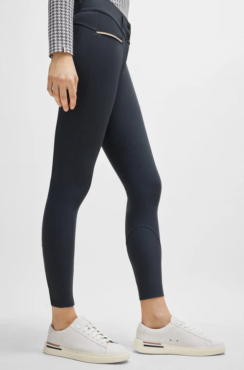 Boss Equestrian Ladies High Waist Breeches with Knee Grip Hannah - these dark grey women's riding breeches are ideal for everyday riding and training. The high waist ensures total comfort and a flattering fit, whilst the silicone knee patch is made without seams to ensure excellent grip and total comfort. To ensure the essential BOSS look, the front pockets and middle back belt loop feature the signature colors, whilst the large phone pocket on the left upper thigh has a BOSS logo patch for a great look. Made from 4-way-stretch material for complete freedom of movement in and out of the saddle, these breeches are certain to become your favorite.
