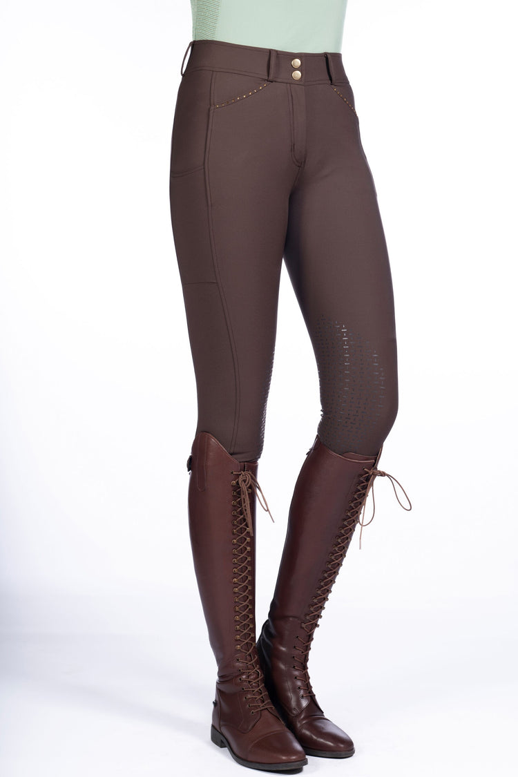HKM Women's Silicone Full Seat Breeches Helene - stylish and practical ladies' riding breeches with full grip. Subtle crystal decoration on both front and back pockets. An extra phone pocket on the side makes sure these pants will become your favorite when riding at home.