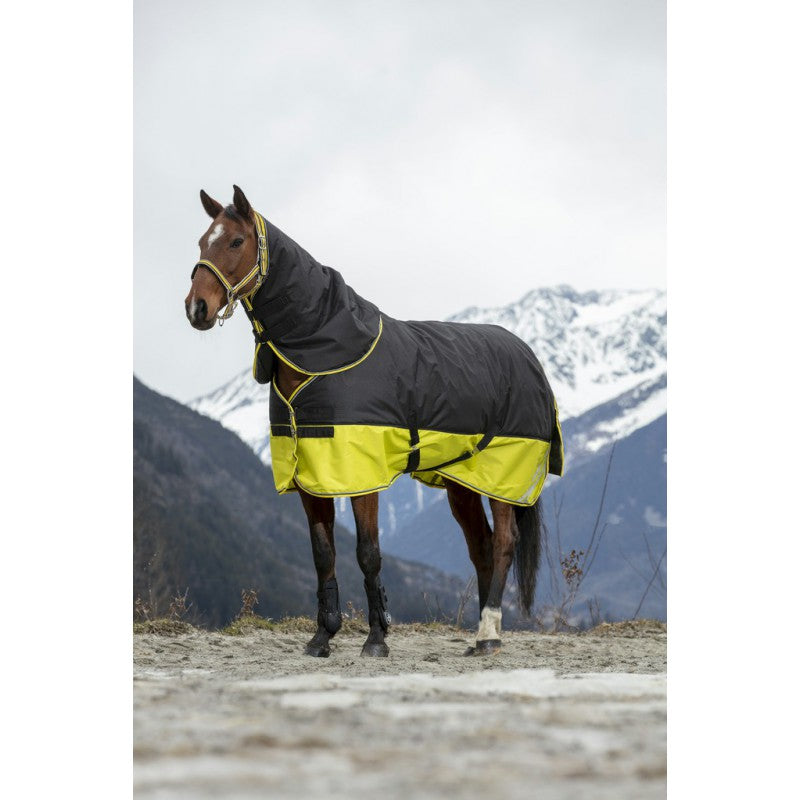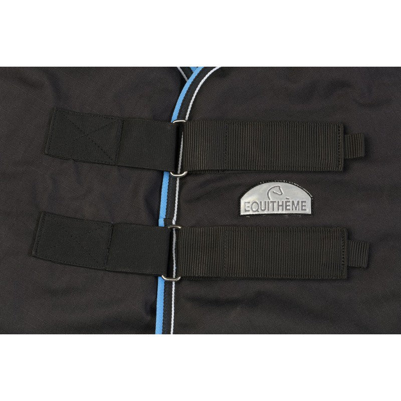 Tyrex 600D Neck Cover - waterproof and breathable 600 Denier ripstop polyester, lined with anti-static and anti-chafing nylon. Fasten with double sided self-gripping bands on elasticated support. Attaches to rug with 3 elasticated straps featuring a central snap and 2 self-gripping bands on sides.
