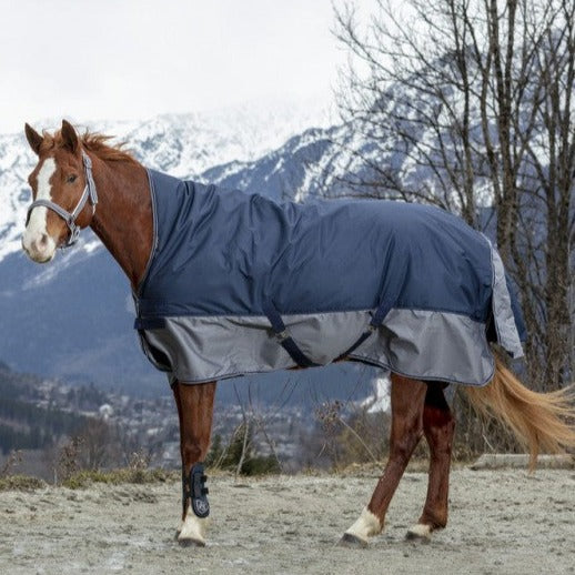 Features a very large waterproof tail flap, synthetic sheepskin padding at withers, low-cross surcingles, and an adjustable rear strap. Quick-release fastening at the chest, reinforced with self-gripping bands.
