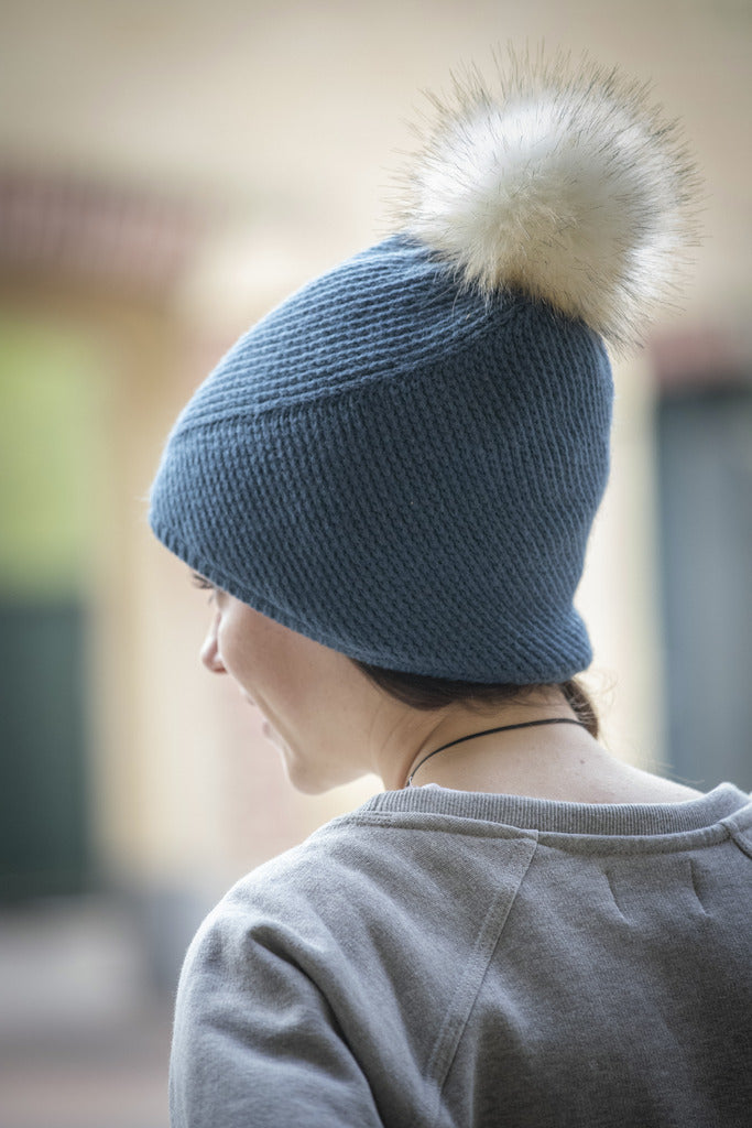 - Fake fur pompom bonnet, lined with off white fleece.