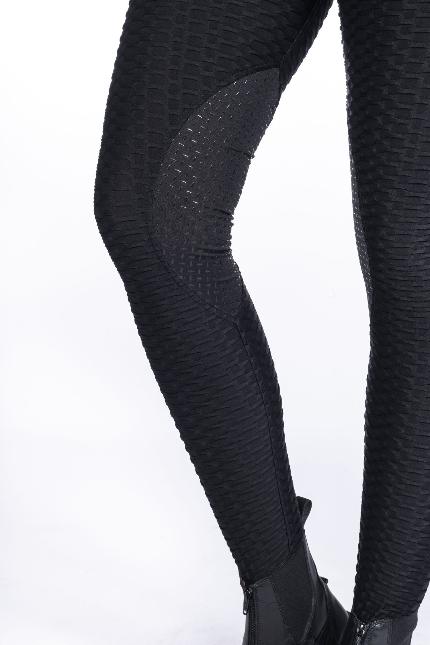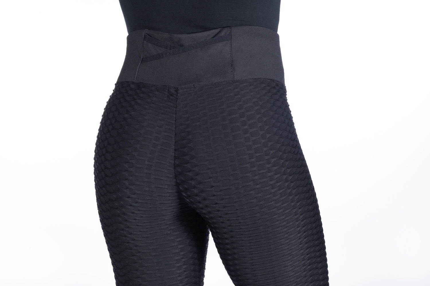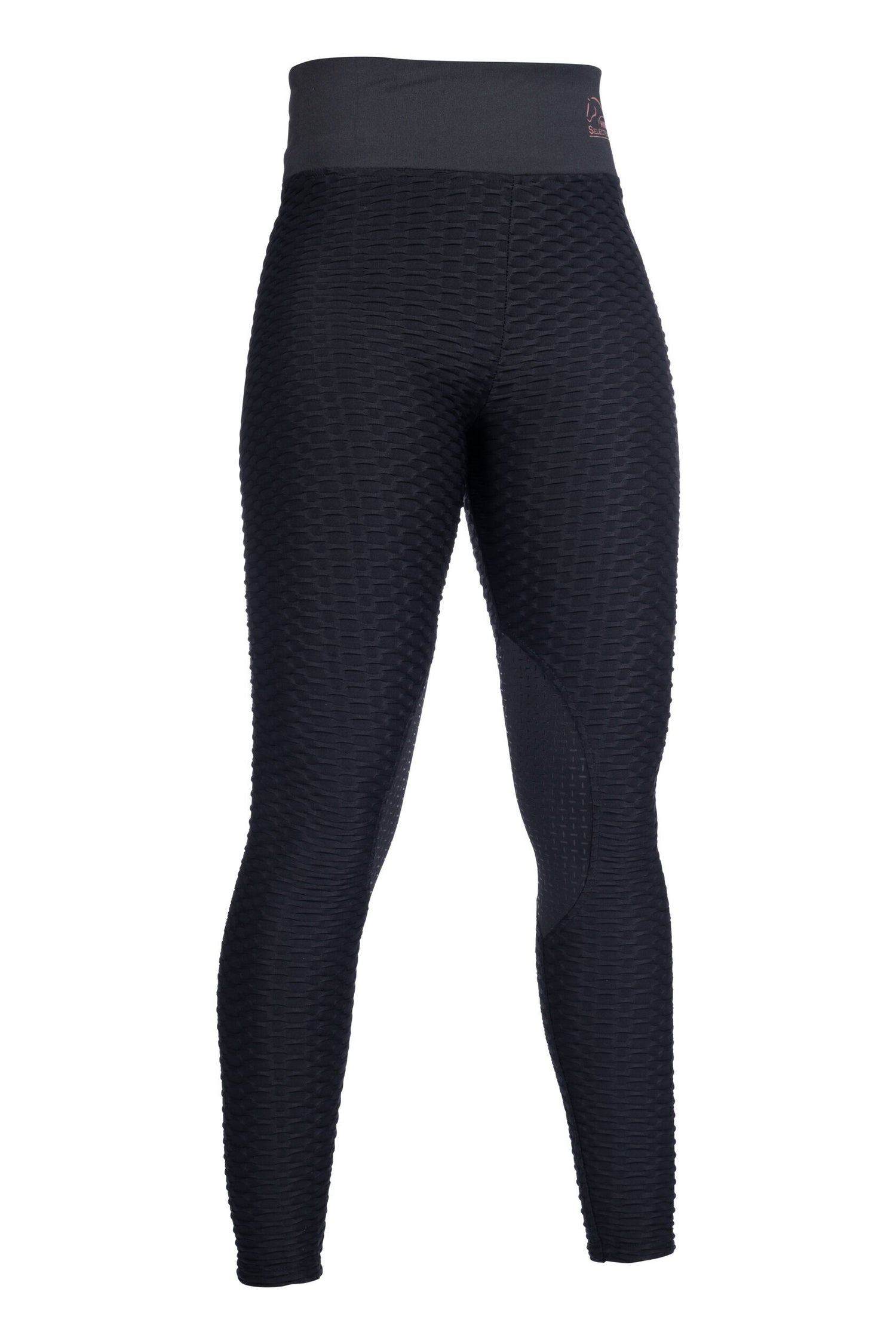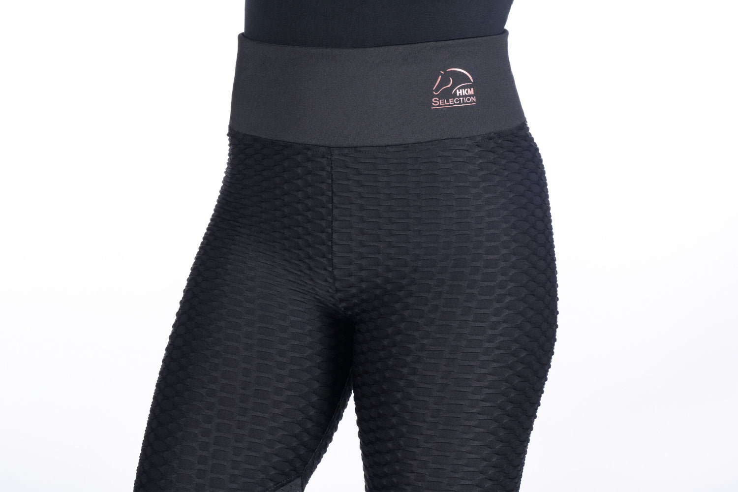 HKM Riding Leggings Edinburgh Shape with Silicone Knee Patch - sporty summer riding tights with a unique 3D structured material for creating a brilliant shape to your legs. designed to increase blood circulation, these riding leggings are high waisted for super comfort and a brilliant fit. The rear accentuating ruched seam creates a push up affect, whilst the integrated phone pocket at the rear of the waistband allows you to have your phone with you at all times when riding and hacking out. A small HKM logo on the front add's the perfect HKM touch and the silicone knee patch adds just the right amount of grip in the saddle.