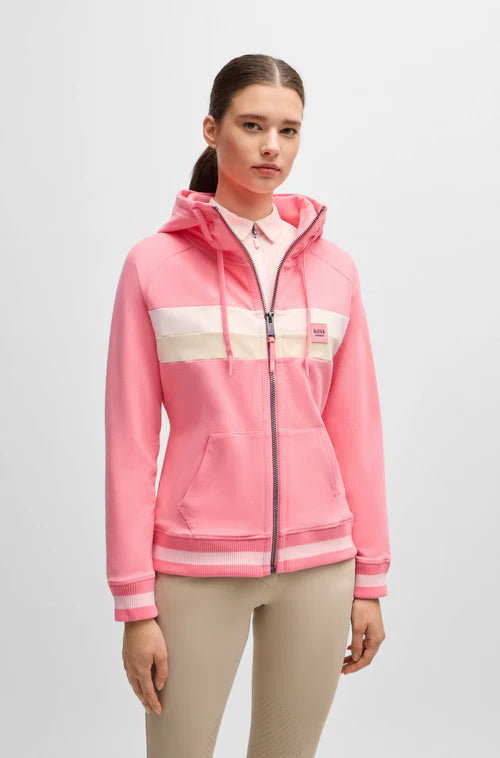 Boss Equestrian Ladies Zip Hoodie Riva - complete your equestrian look with this stylish hooded sweat jacket from Boss Equestrian. Featuring contrasting colored stripes on the chest as well as the Boss logo patch for a great look. A large hood and kangaroo pouch pockets will keep you snug and warm. Made from super-soft Italian sweat with stretch as well as a brushed inside, the jacket is perfect for riding in or wearing casually with jeans.