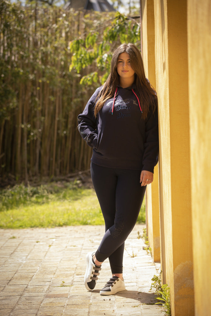 Penelope Collection Topty Sweatshirt - this beautiful and practical hoody can be worn in or outside of the stable. Because it is neither too thin nor too thick, it is ideal for spring or fall season. In the large central pocket you can store small essentials and the strip with sequins on each arm adds a chic touch. Furthermore, this sweatshirt is equipped with elasticated bands on the wrist and waist for more comfort. The Penelope logo is on the chest and made of sequins as well. Under the logo "Believe in your equestrian dream" is written.