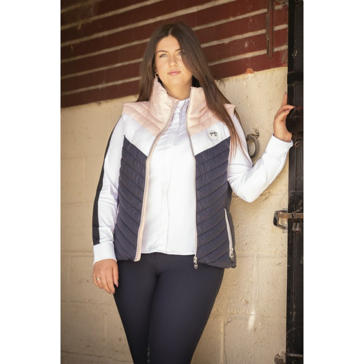 Penelope Collection Camelia Vest - A lightweight and comfortable vest with chic French design for lady equestrians. The color block look is perfect this spring summer vest. Super light to wear, but still warm, Camélia is your perfect ally for the stables, or the city. It comes in Silver/ White/Artic Blue or Navy/White/Pink, for a perfect look. Super comfortable to wear, it comes with a high neck, and two pockets.