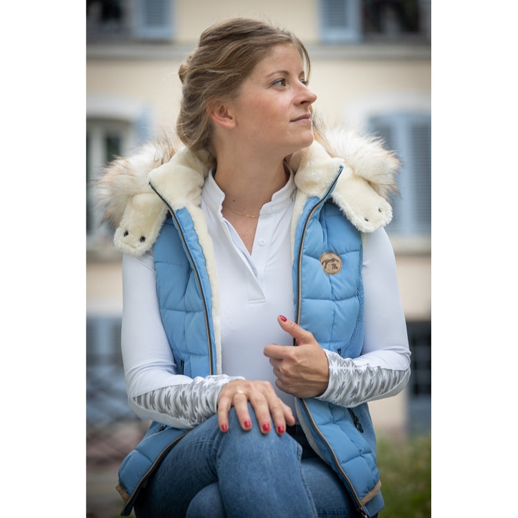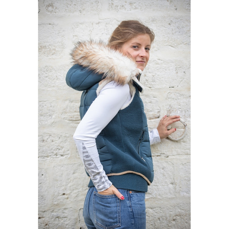 Penelope Roger Vest - this incredibly stylish ladies riding gillet features a large faux fur hood and faux sheepskin lining for warmth and exceptional looks. The contrasting coloured detailing combines perfectly with the quilt padding and elasticated waist for a brilliant fit. Two large front pockets with zips allow you to store your valuables when riding or hacking out.