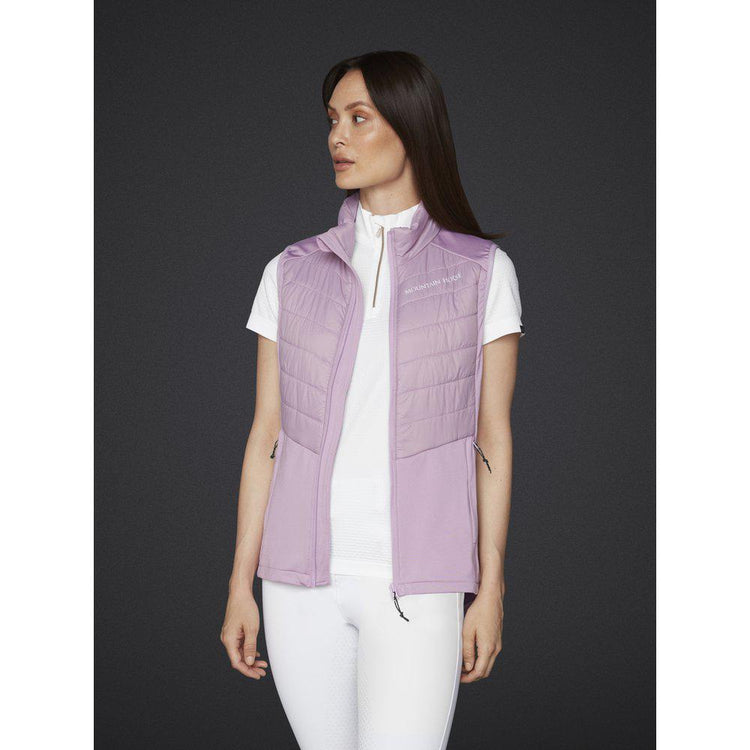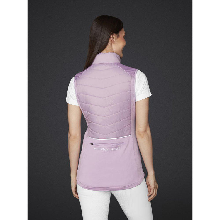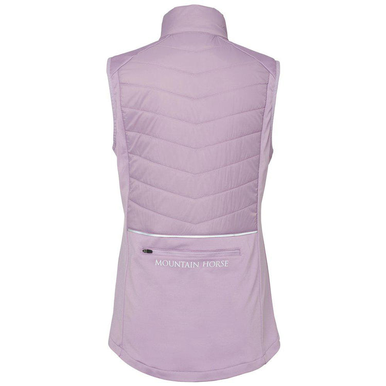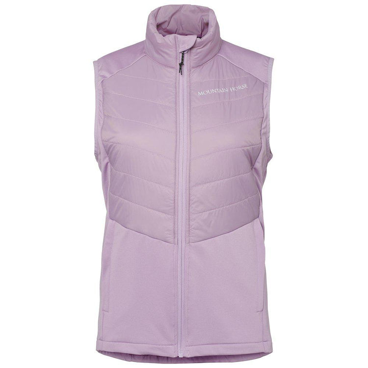 Mountain Horse Women's Prime Hybrid Vest - Ladies' equestrian lightweight vest with water and wind repelent quilted section at upper body. Flexible tech fleece with soft brushed inside along sides. Super comfortable for riding! It can be worn during the chilly mornings and evenings in the summer or as a mid layer during the winter or colder days.