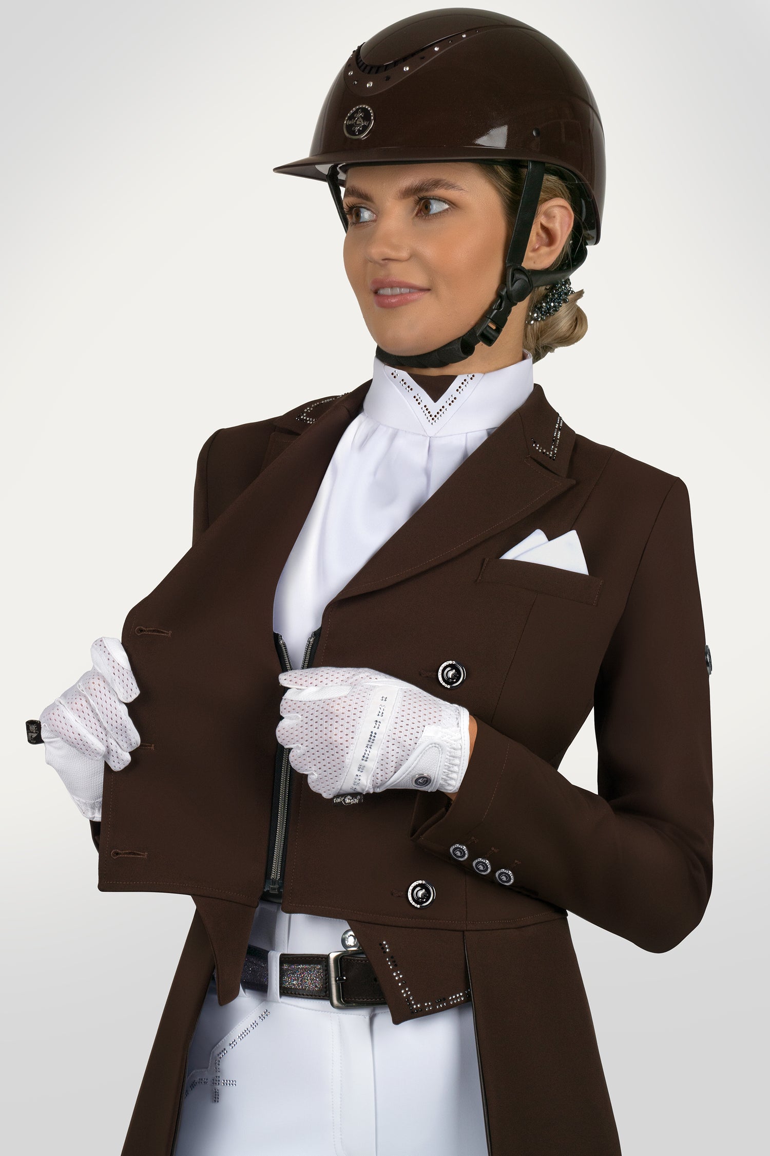 Cleverly designed, the double button front features a hidden inner zip to keep the jacket flat to ensure a perfect fit. Made from highly breathable and elasticated fabric for freedom of movement and comfort, the jacket also features eye lets under the arms for increased ventilation. Mesh lining further increases breathability whilst the faux leather on the underside of the weighted tails adds the final touch to this spectacular ladies tail coat.