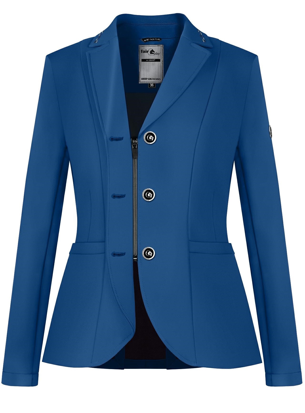 Fair Play Show Jacket Natalie Imperial Blue - incredibly striking women's competition jacket with beautiful detailing for a glamorous show ring look. The subtle crystal edging on the collar ensures you'll stand out beautifully in the ring, whilst the beautiful rich plum color and tailored cut create an elegant silhouette. A hidden zipper behind the button placket keeps the jacket flat to create a perfect fit.