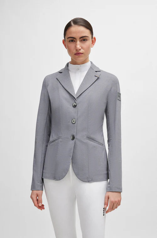 Boss Equestrian Ladies Competition Jacket Anna - a stylish women's show jacket in a classic cut for a polished look in any arena. This competition jacket is in the true BOSS style with gunmetal buttons, signature stripe flag on the collar and a Boss logo patch on the sleeve. The ultralight material is highly breathable as well as offering plenty of stretch to ensure a perfect tailored fit as well as complete freedom of movement when competing. Freejump Airbag Compatible, the jacket can be worn with a Freejump Airbag vest under it. With a 3 button front and double rear vent it's the perfect jacket for both the show jumping and dressage ring.