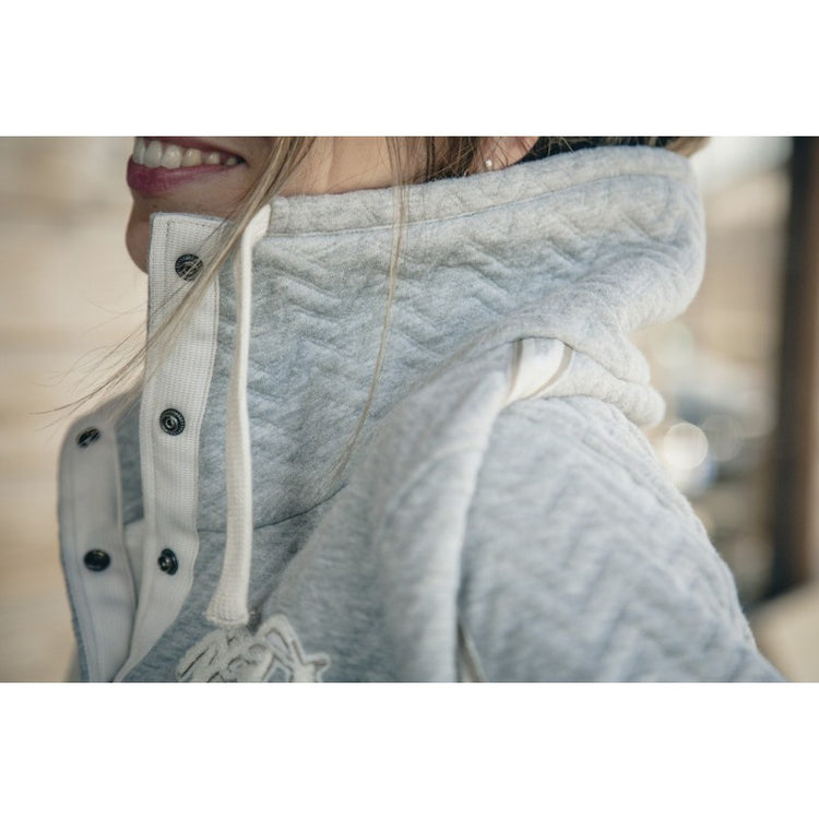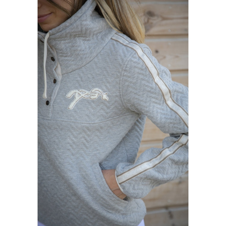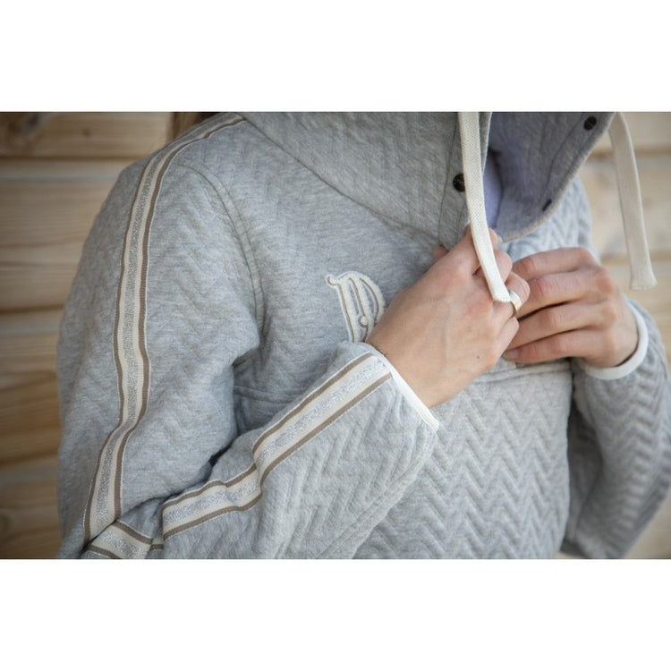 Penelope Pepita Sweater - a sweatshirt so comfortable that you can wear it everywhere, in and out of the saddle. This cozy sweater has many details that make it very stylish. For example the unique herringbone quilting, the standing high collar with buttons bearing the Penelope logo and white lining. On the chest, fluffy terry cotton embroidery of the logo and the 'PL' monogram adds to the comfy feeling of this sportswear piece. Finally, along the arms, a pretty taupe, cream and shiny silver stripe finishes off the look of the Pépita sweatshirt. It has two slit pockets on the front and an off-white braid that makes the bottom of the sweatshirt a little tighter for a fitted effect.
