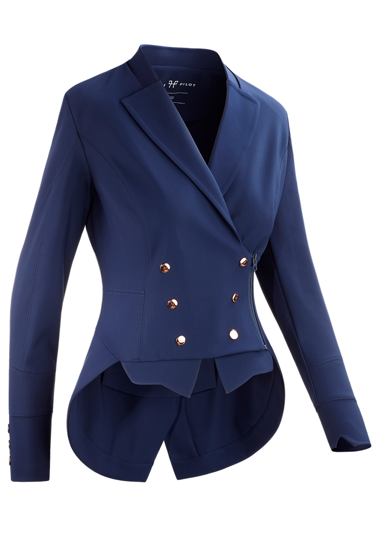 Horse Pilot Women´s Dressage Coat Mini Frac - this short dressage tail coat is perfect for riders wanting an elegant look, without compromising on total comfort. Made from soft, technical stretch fabric, the short tails allow complete freedom of movement when competing. The single rear flap, tailored fit and rose gold colored buttons give the coat a stylish look, whilst the fabric remains highly breathable and quick drying to ensure your comfort.