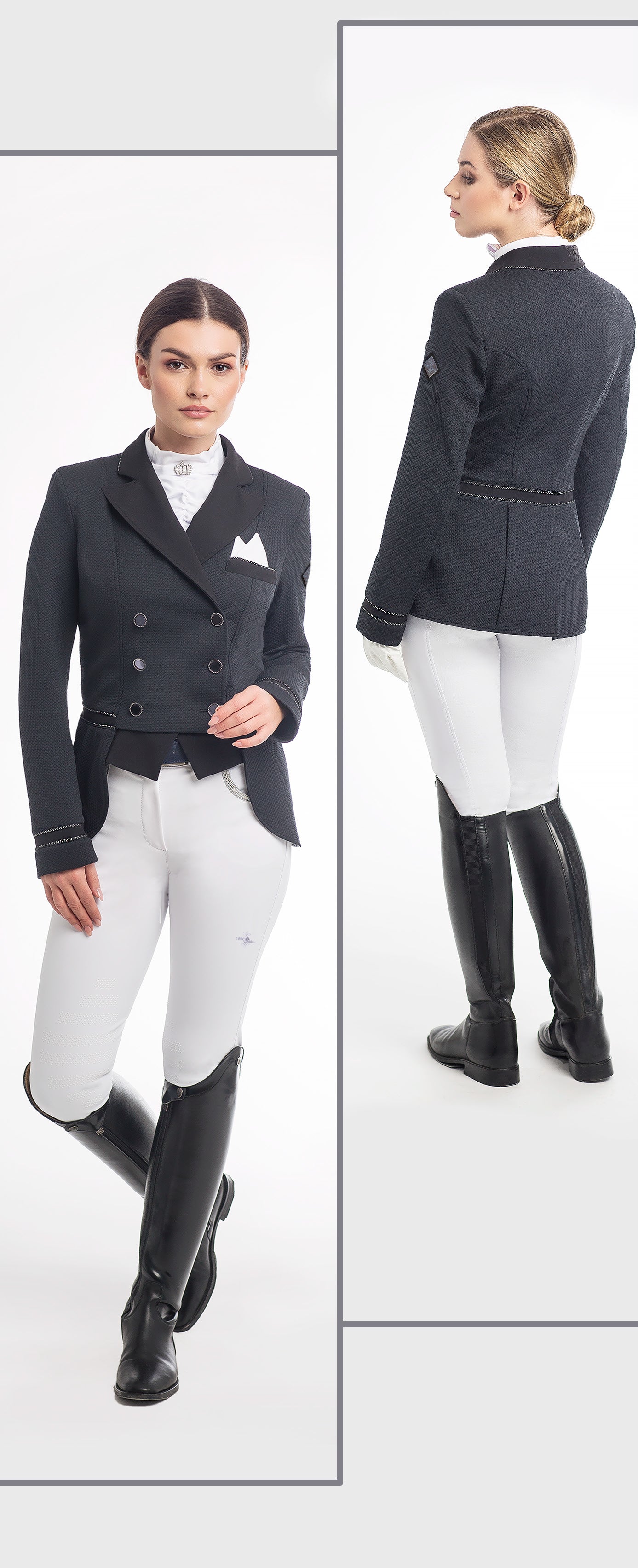 Show Jacket Elizabeth COMFIMESH™- this elegant show jacket is made from the extremely lightweight and breathable COMFIMESH™ fabric which feels great against your skin and ensures comfortable wear. Having no lining, this jacket will allow for an excellent air ventilation and prevent moisture accumulation. A white satin pocket square adds an extra special finish and makes Elizabeth a wonderful jacket choice for your competition.
