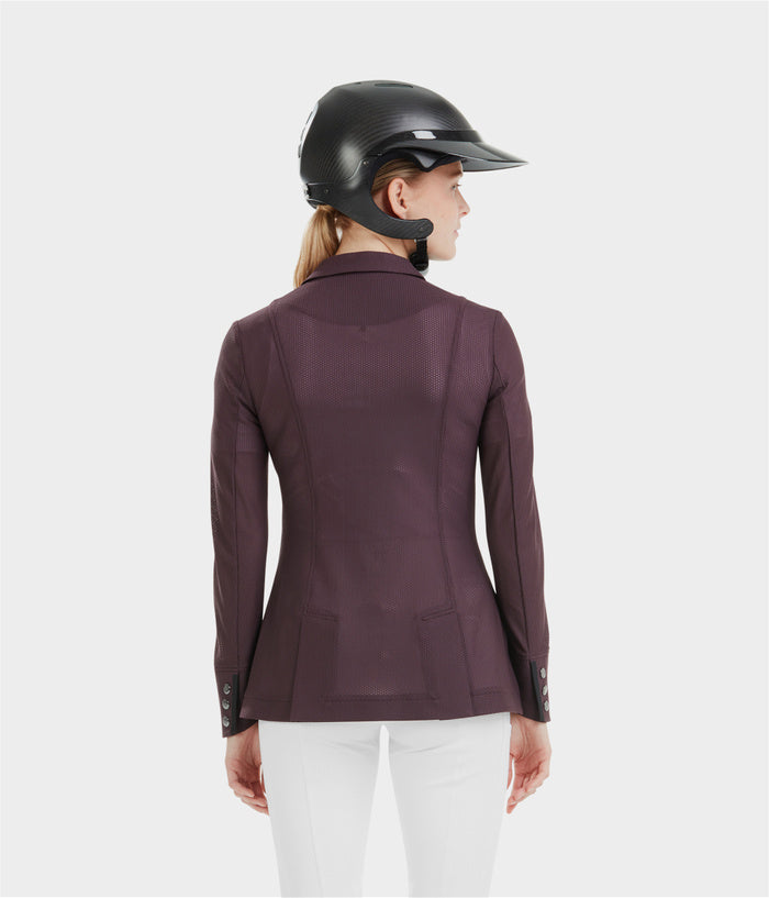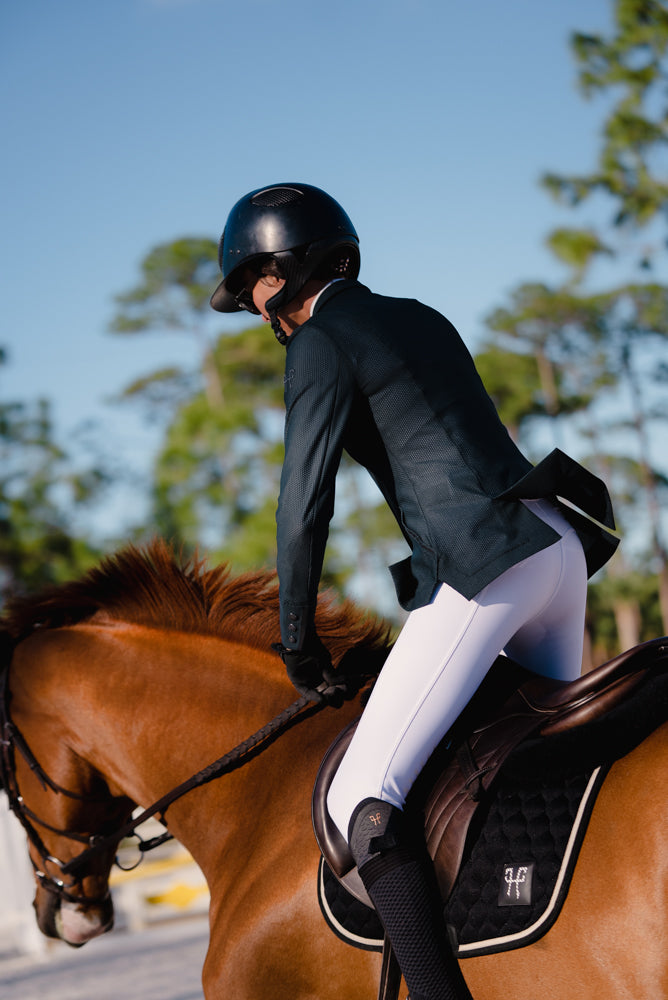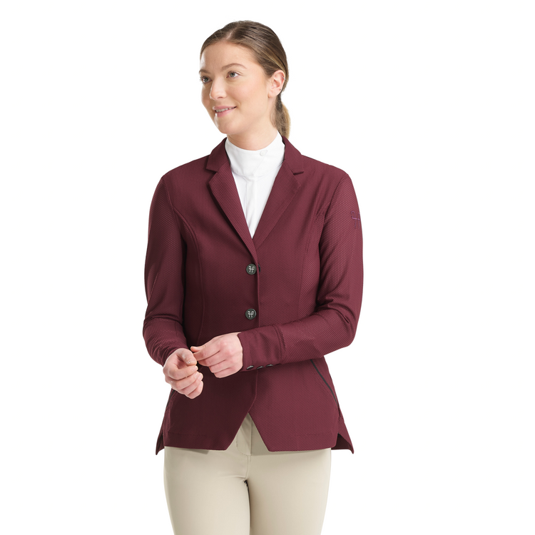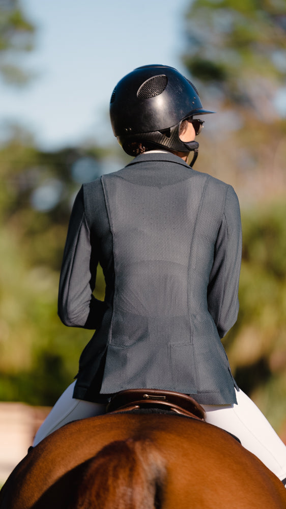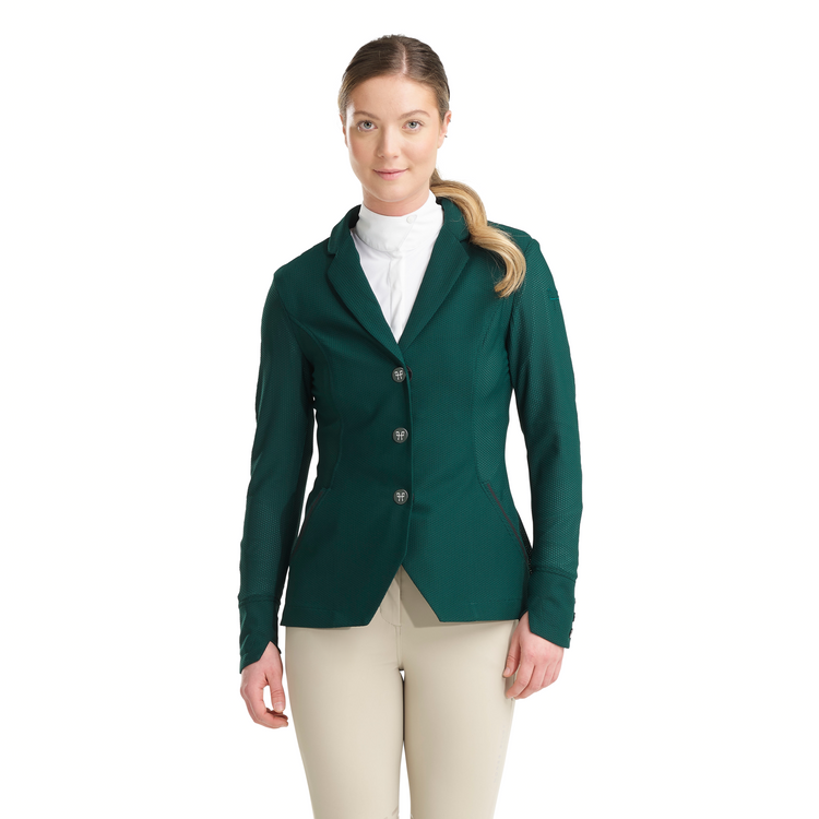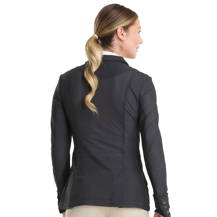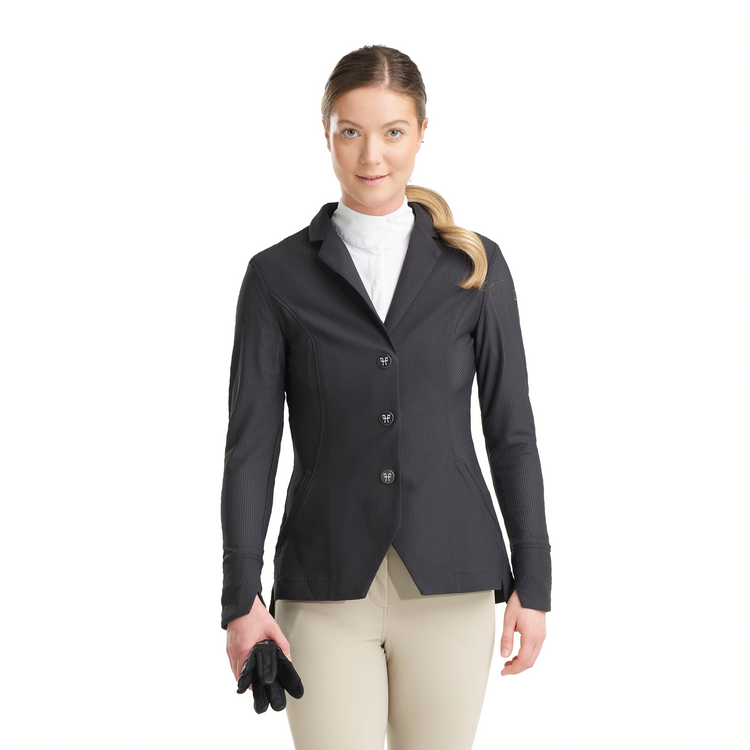 Horse Pilot Aeromesh Women's Show Jacket - the ultimate women's mesh competition jacket! Ideal for the summer months, this all over perforated show jacket will keep you cool and comfortable on hot days out competing. It features an overall micro-honeycomb structure that wicks the moisture away and allows heat to escape easily. It is ergonomically shaped to move along with the rider. The new 2-way stretch fabric is light like a second skin and very breathable. The jacket also features magnetic buttons that can be easily closed with one hand. It's pre-shaped sleeves and ergonomically designed wrists suit the riding position perfectly and offer the rider more freedom. It is also compatible with Horse Pilot airbag vests.