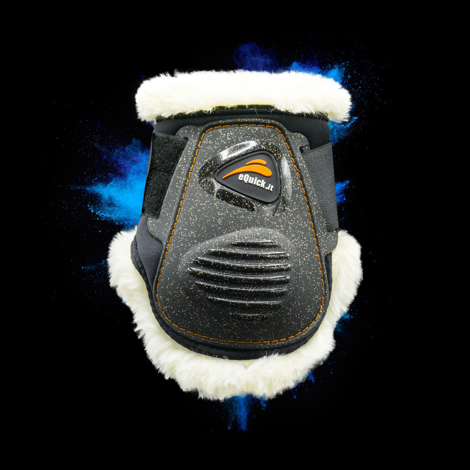 eQuick eLight Glitter Fluffy Fetlock Boots - sparkle in the sun with this practical hind boots from eQuick. The boots have a reinforced TPU shell and are equipped with a double Velcro to individually fit them to each horses leg. The 100% animal friendly, artificial sheepskin is super soft and easy care.
