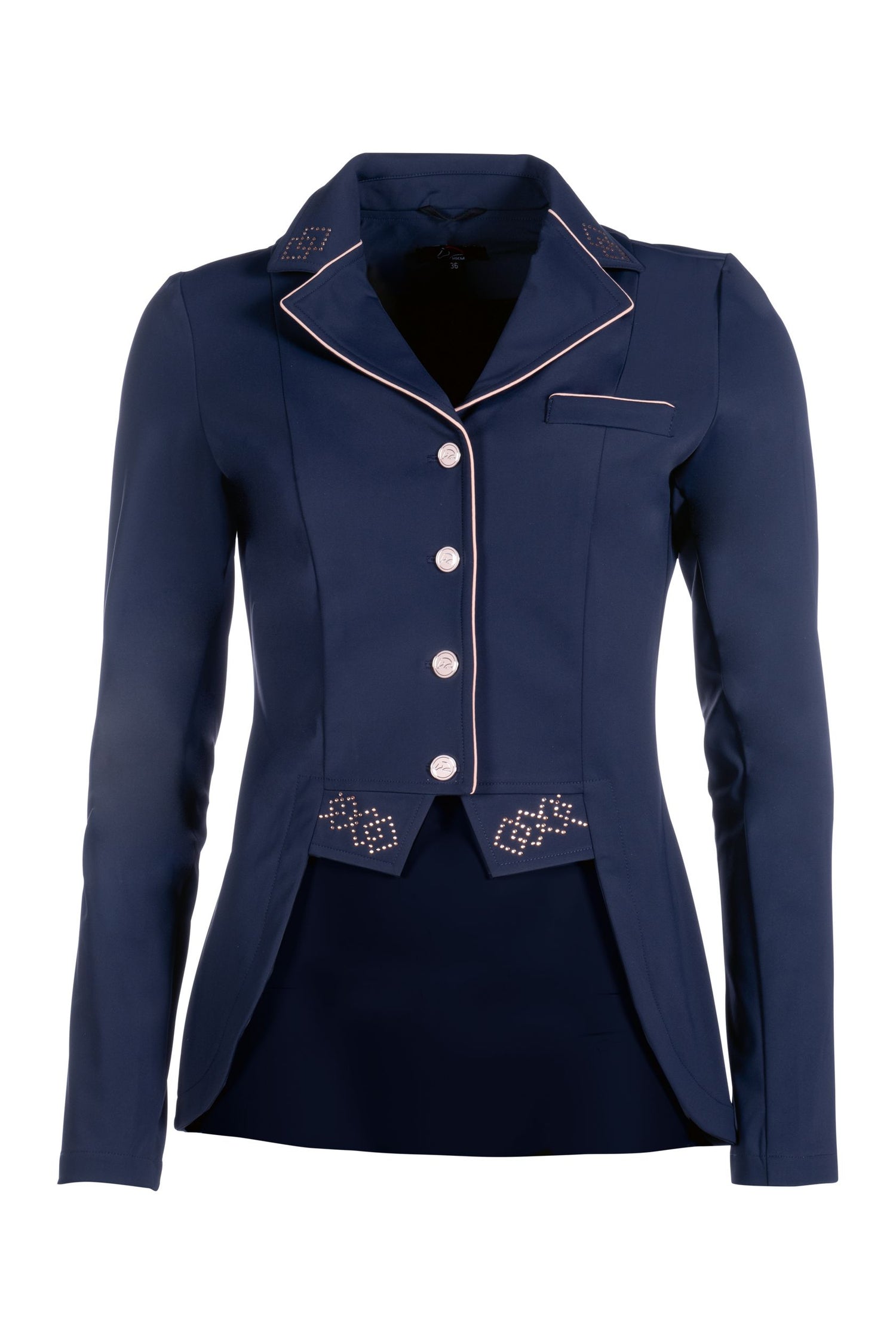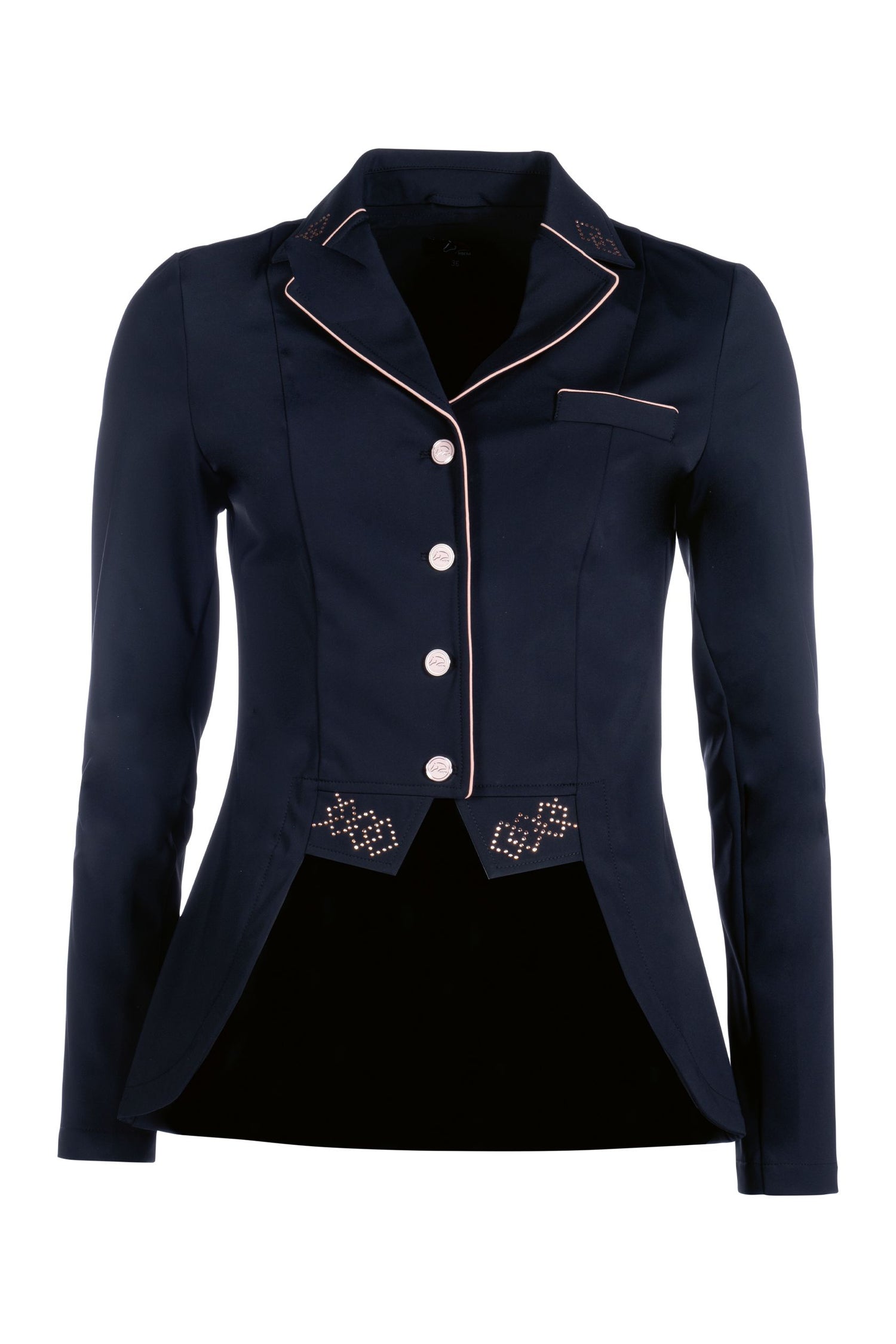 HKM Short Tail Coat Audrey - this gorgeous short frak is the perfect choice for dressage riders looking for an affordable competition jacket with touch of bling! The elegant piping on the collar, pocket and front combine perfectly with the fine crystal detailing on the front flaps and collar. Stretch fabric ensures freedom of movement, whilst the tailored fit creates a stunning look. Highly breathable, this show jacket has it all at an affordable price!