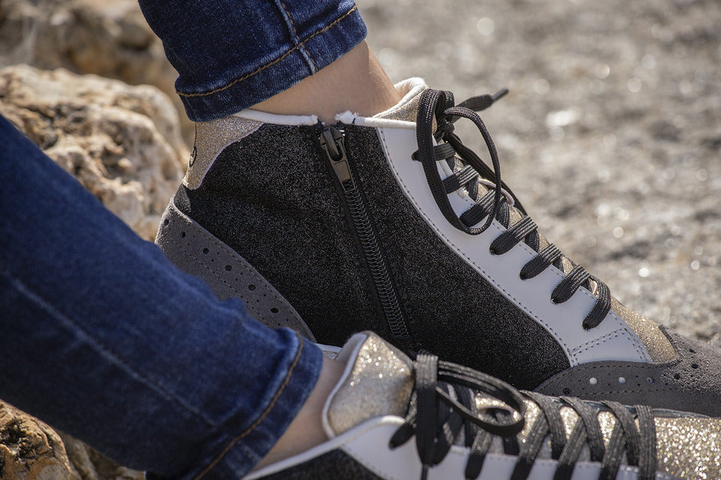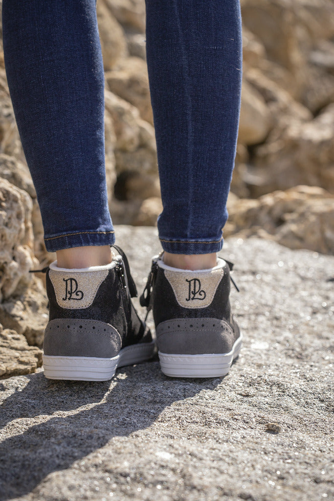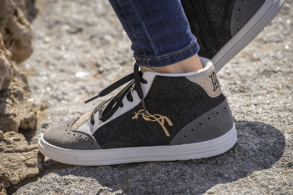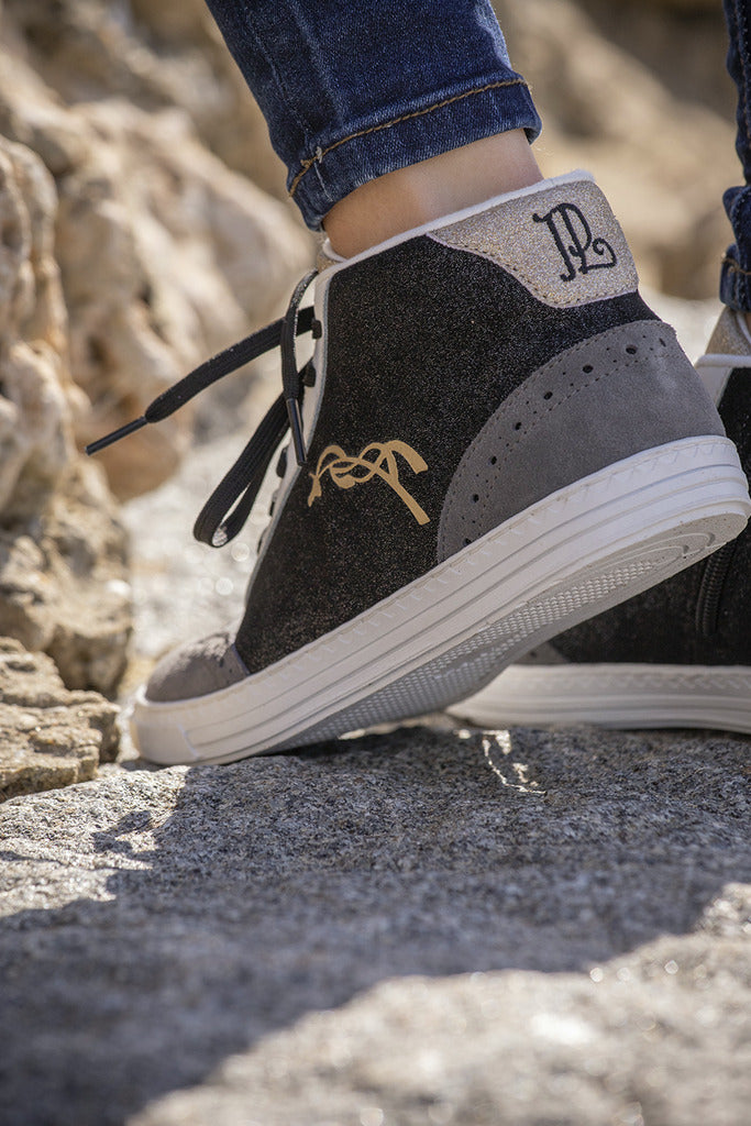 Penelope Jupiter Women's Sneakers - Designed with care and love, these stylish sneakers from Penelope City Life Collection are sporty, cool and comfortable. They support the ankle and are very comfortable to walk in. The black, gold and grey tri-color design combined with the texture of suede leather makes these sneakers very chic and refined. The gold color has glitter in it to give the shoes an extra bling. The Penelope logo on the side and PL monogram on the back shows off the Penelope equestrian identity. These sneakers are the perfect casual shoes for both in and out of the stable. The colors and style match easily and perfectly with any riding breeches or jeans. Thanks to the inner zipper, you can put the shoes easily on an off and never need to untie the lace