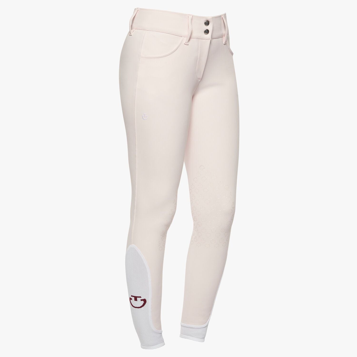 Cavalleria Toscana Women's American Breeches with Knee Grip light pink - ladies knee grip riding breeches, ideal for every day riding. With a comfortable high waist with two a button front, these jumping knee patch breeches ensure total comfort both in and out of the saddle. Special silicone on the inside of the wide waistband help to keep your shirt nicely tucked in when training and competing. The CT logo design silicone knee grip offers the ideal amount of grip in the saddle, whilst the knit sock on the calf creates less bulk under your boots or chaps.