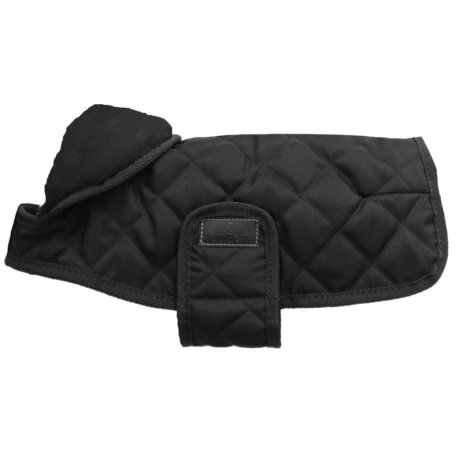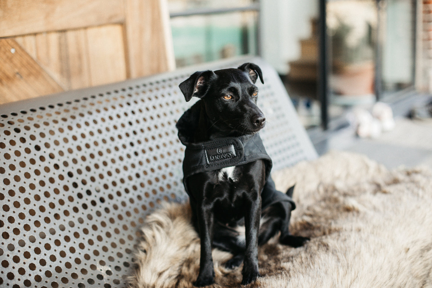Kentucky Dogwear Limited Edition Dog Coat Black/Black - a luxurious dog rug in a sophisticated and sleek all black design. Designed to match the Kentucky Horsewear Rug collection, the rug features a filling of 160 grams with the extra soft artificial rabbit skin lining that is designed for extra comfort and creates tiny air pockets that trap and retain the body heat of the dog. The incredibly soft lining also polishes the dog's hair whilst the artificial sheepskin around the collar area offers further comfort and added warmth. The hood can be folded back over the neck for further protection.