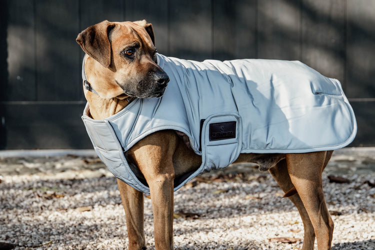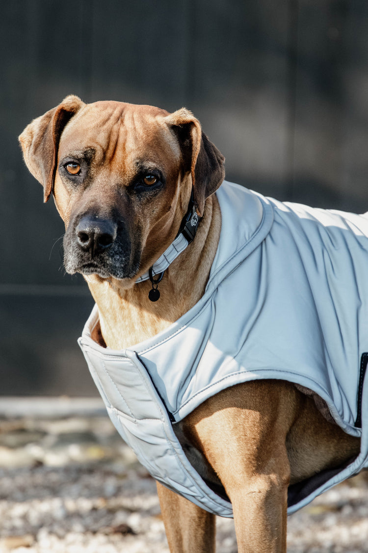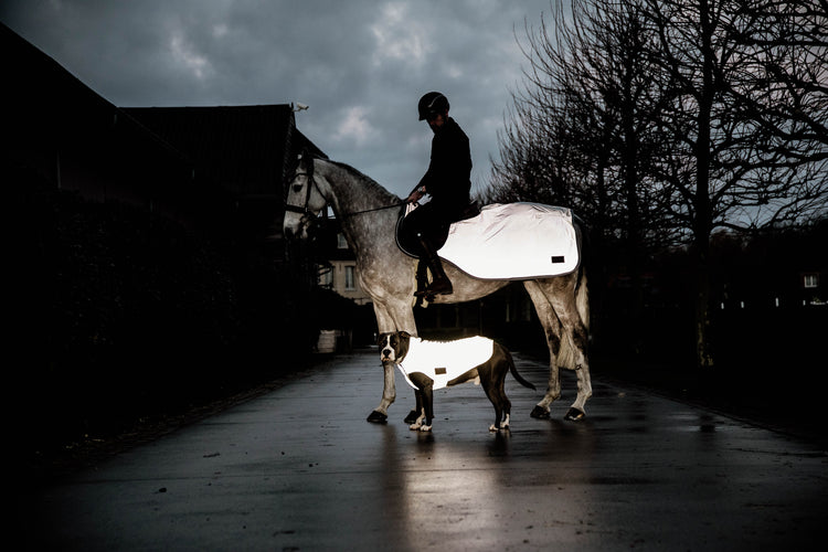 Dog Coat Reflective & Water Repellent with Belly Cover 150g - a brilliant dog rug for using in poor light that also offers the right amount of warmth. The coat is reflective to ensure maximum safety and visibility of your beloved dog. Water repellent for rainy days, the hood can be folded up for extra protection, the belly flap makes sure that your dog is protected and doesn't loose warmth over an exposed belly. Made from very soft material, the rug is 100% reflective and has two Velcro closures for the perfect fit. A notch made of artificial leather allows you to pass your lead through the rug and attach it to your dogs harness if needed.