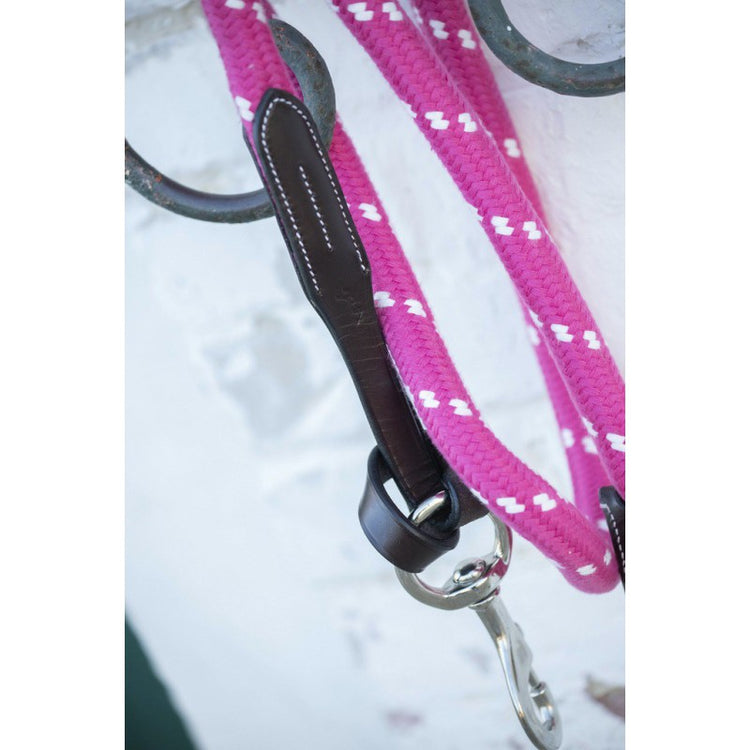 Penelope Lead Rope Corde - A girly lead rope, for every rider addicted to flashy pink! Here comes the Pénélope pink lead rope made of a wide and thick pink and white rope, fitting well into our hands. It is connected to the stainless steel thanks to a black or brown leather part. Leather part is thick but souple, since it is attached to the hook thanks to a knot. On the other part, to the lower part of the rope, is a leather end piece sewed on the lead rope, to make it look extra fancy. Collections Pénelope lead rope can match any halter to move the horse once out of the stable.
