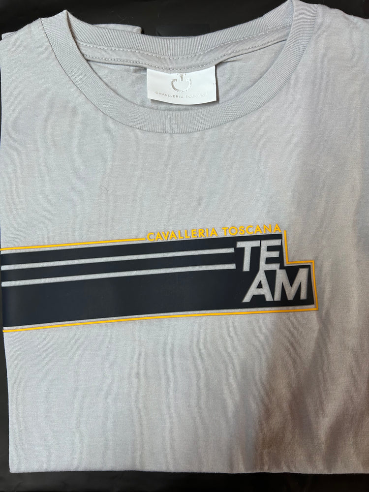 Cavalleria Toscana Junior CT Team Raceway T-Shirt - this sporty cotton t-shirt is the perfect shirt for the avid young equestrian. Ideal for both boys and girls, it features a large Cavalleria Toscana Team logo on the front in racing stripes style as well as a small CT Team logo on the back for a great look. The super soft cotton fabric is highly breathable, making it the ideal choice for riding in as well as wearing casually with jeans or shorts.