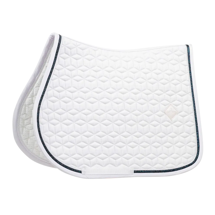 Kentucky Saddle Pad Glitter Rope Jumping - truly shine in this stunning saddle blanket from Kentucky. The Glitter Rope saddle cloth gives a unique look thanks to the special star quilting in combination with the striking glitter edging. The anatomic shape and excellent cushioning ensure your horses comfort, whilst no annoying straps are needed to attach to the saddle, only the nylon girth strap on both sides.