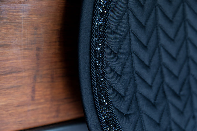 This saddle pad has a fishbone quilting and is made with a stunning Glitter Stone binding. Furthermore, it has no annoying straps to attach to the saddle, only a nylon strap for the girth. It is machine washable at 30°, no dryer. We advise you to use a washing bag to avoid the pearls from damaging.