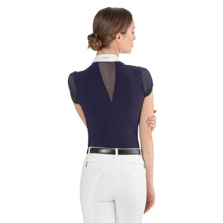 A perfect, flattering fit, amazingly feminine sheer, net like fabric sleeves and back insert emphasize the silhouette and modern style our equestrian sport offers. The hidden button detailing enhances the natural elegance of the white collar and logo embroidery giving it the final, essential touch.