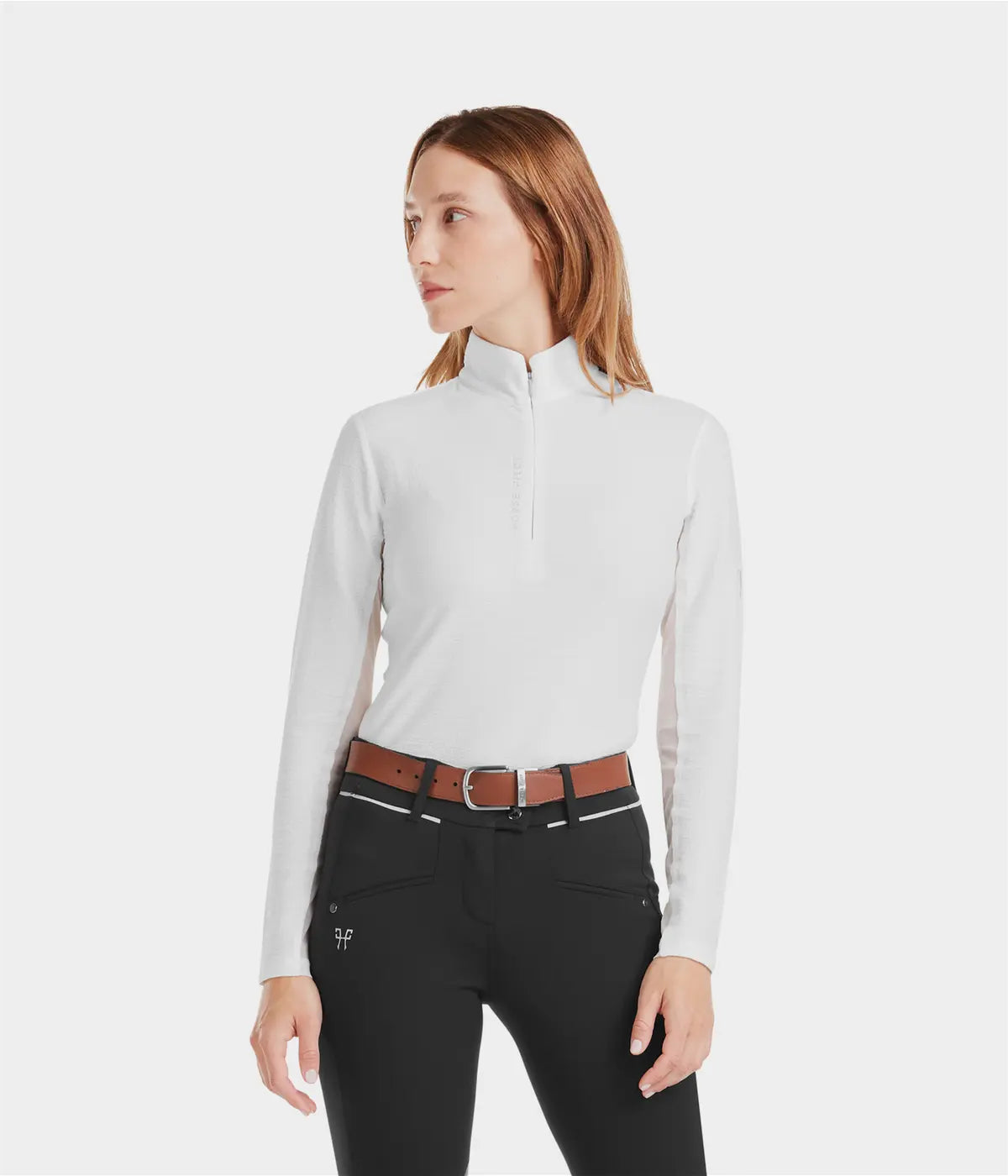 Ontworpen voor training bij zonnig weer: onzichtbare ritssluiting in de nek, mesh-panelen onder de armen en op de schouders voor een betere luchtcirculatie. Ultralicht, ademend en met onze UV-Block-technologie op de alveolaire stof garandeert het bescherming tegen de zon en droogt het snel. Het is zeer rekbaar en past zich aan de houding van de ruiter aan, ongeacht zijn of haar rijstijl. Verkrijgbaar in het wit voor onze meer competitieve piloten!