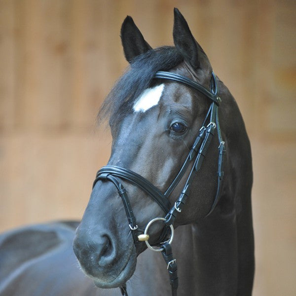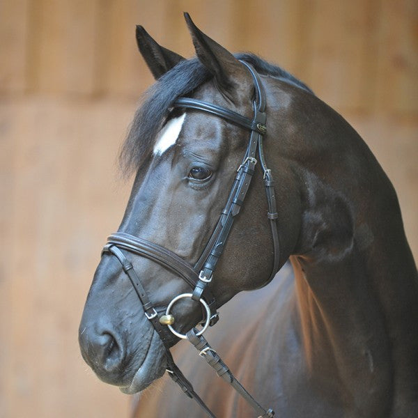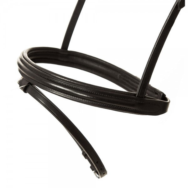 Kavalkade Hoofdstel Quintin - De klassieke Engelse gecombineerde trens Quentin is gemaakt van zeer goede kwaliteit leer. Dit leer staat voor een zeer goede duurzaamheid en robuustheid voor dagelijks gebruik. De frontriem is eenvoudig en recht. Het kopstuk en de neusriem zijn zacht onderlegd en sluiten perfect aan op het paardenhoofd. De neusriem loopt over waardoor er minder gespen nodig zijn.