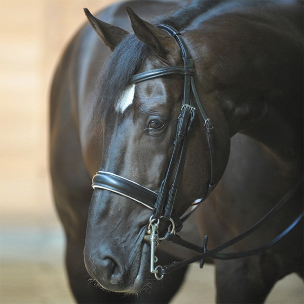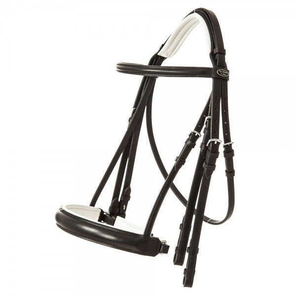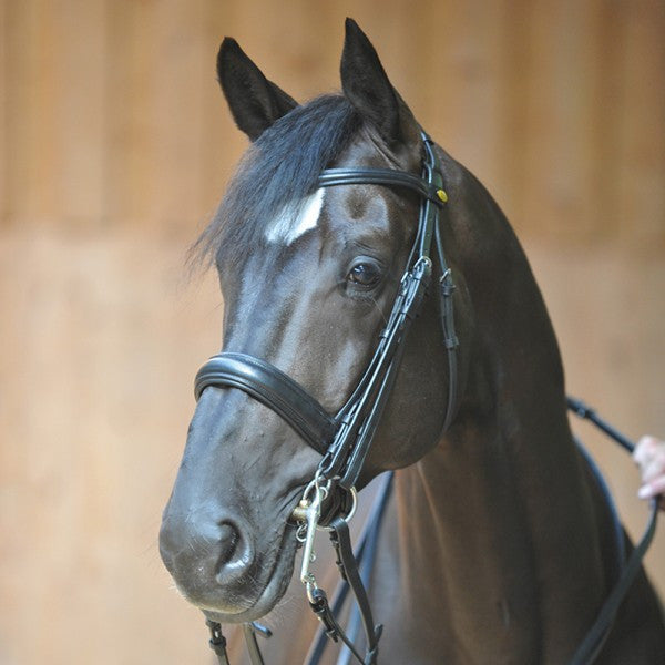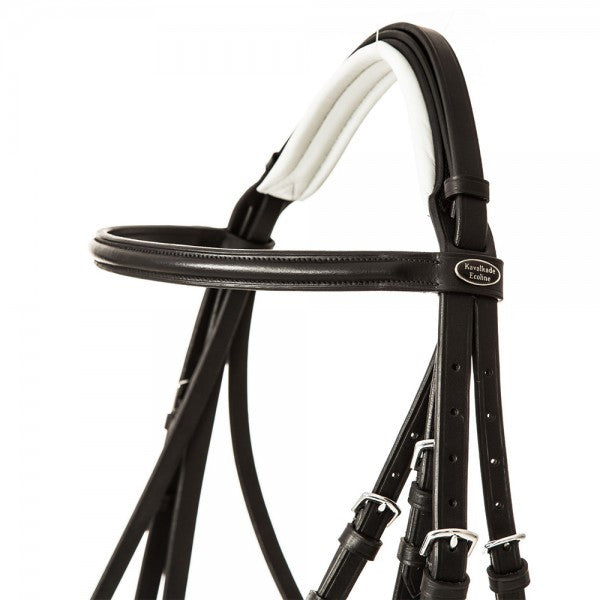Kavalkade Stang & Trens Hoofdstel "Dacira" - heerlijk zacht leer van hoge kwaliteit, drank hoofdstel met naar keuze een zwart onderlegde neus en kopstuk of een wit onderlegde neus en kopstuk. Dit klassieke hoofdstel is ontworpen met het comfort van uw paard in gedachten, dus het ziet er niet alleen geweldig uit, maar het komt ook uw paard ten goede. Perfect voor scholing of wedstrijden tegen een uitstekende prijs.