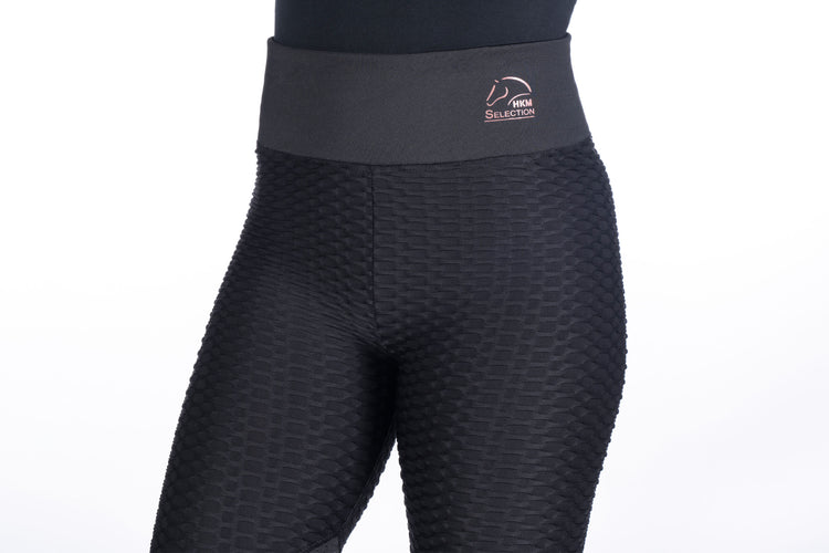 HKM Rijlegging Edinburgh Shape met Siliconen Kniestuk - sportieve zomer rijlegging met een uniek 3D-gestructureerd materiaal voor het creëren van een schitterende vorm aan je benen. Deze paardrijlegging is ontworpen om de bloedcirculatie te verhogen en heeft een hoge taille voor supercomfort en een schitterende pasvorm. De accentuerende ruches aan de achterkant zorgen voor een push-upeffect, terwijl het geïntegreerde telefoonzakje aan de achterkant van de tailleband ervoor zorgt dat je je telefoon altijd bij je hebt tijdens het rijden en hacken. Een klein HKM-logo op de voorkant zorgt voor de perfecte HKM-touch en de siliconen kniepatch zorgt voor precies de juiste hoeveelheid grip in het zadel.
