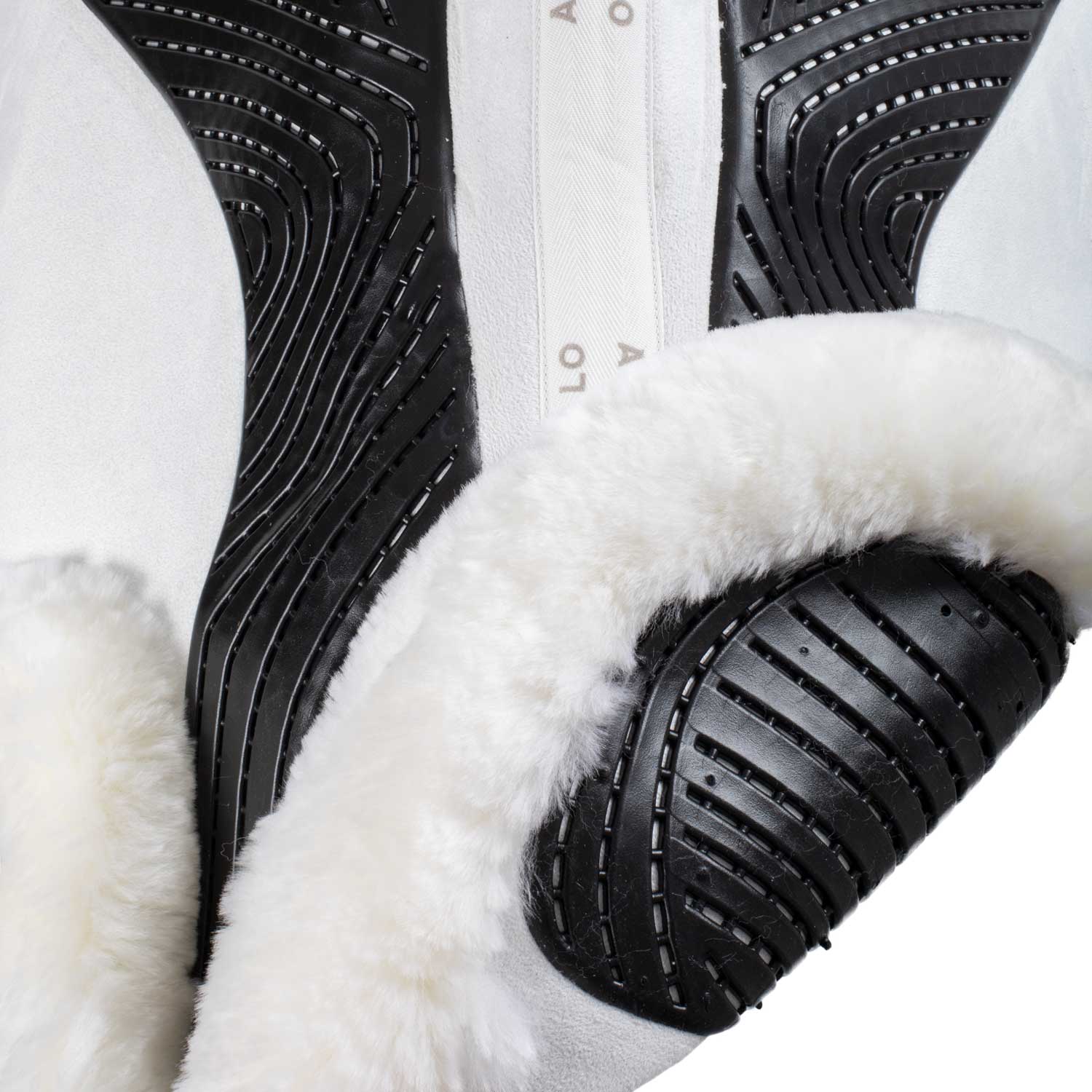 Acavallo Twin Sided Gelpad Springen Numnah met volledige schapenvachtrand - Deze elegante dubbelzijdige gelpad is ontworpen om de rug van uw zadel en paard te ondersteunen door de unieke schokabsorberende en antislipeigenschappen van Acavallo's therapeutische gel te combineren met de exclusieve eigenschappen van schapenvacht . De antislipeigenschappen zorgen voor een perfecte pasvorm van het zadel, zelfs bij onverwachte bewegingen in welke richting dan ook. Deze luxueuze numnah met een volledige rand van schapenvacht is ontworpen om zich diep aan te passen en te vormen naar het silhouet van het paard, terwijl de oppervlaktedruk gelijkmatig wordt verdeeld.