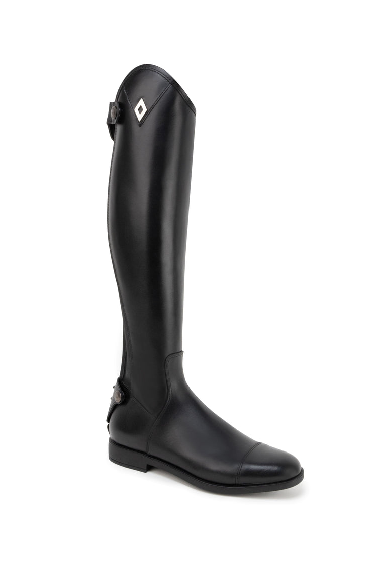 Een extra sterke YKK 9 mm metalen rits met dubbele stiknaad verhoogt de slijtvastheid. De toevoeging van de bovenste sluiting in leer en elastiek met een drukknoop helpt te voorkomen dat de rits naar beneden glijdt. Om een comfortabele pasvorm en volledige bewegingsvrijheid te garanderen, hebben de laarzen een elastisch paneel aan de achterkant. De sporenrust biedt drie verstelbare niveaus, terwijl de ontwerpzool zorgt voor perfecte grip en uitzonderlijk flexibel comfort. Als je op zoek bent naar een laars die je zowel dagelijks als tijdens wedstrijden kunt dragen, dan zijn dit de laarzen die je nodig hebt!