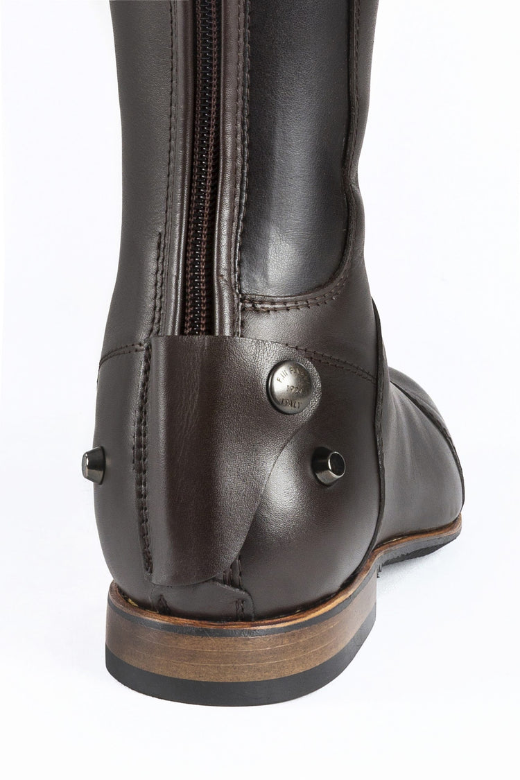 Fabbri Rijlaarzen Pro Derby – Deze briljante jachtlaarzen zijn ontworpen voor ruiter die uren in het zadel doorbrengen. 100% gemaakt in Italië van een uniek stuk premium kalfsleer, bieden de laarzen een op maat gemaakte pasvorm voor optimaal comfort tijdens het rijden en deelnemen aan wedstrijden. De voering is gemaakt van het fijnste kalfsleer, wat uitzonderlijk comfort en uitstekende ademend vermogen biedt. De extra sterke YKK 10 mm rits met dubbele stiknaad is ontworpen om de slijtvastheid te verhogen, terwijl de bovenste leren ritsbeschermer met een drukknoop voorkomt dat de trekker naar beneden schuift tijdens het rijden. De sporenrusten zijn van metaal voor verbeterde duurzaamheid, bevestigd met klinknagels en lateraal gepositioneerd om ervoor te zorgen dat je sporen op hun plaats blijven.